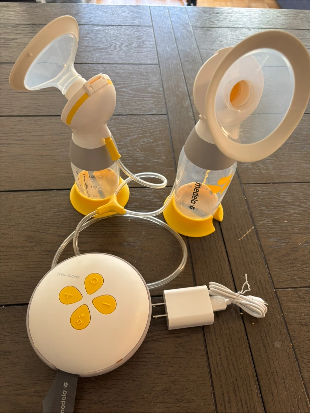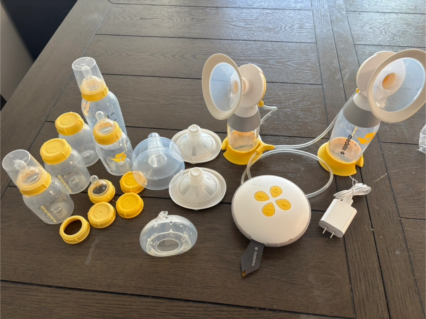 Medela dual electric breast pump includes: 2 bottles, breast shields, pump with charger, 2 bottle stands.