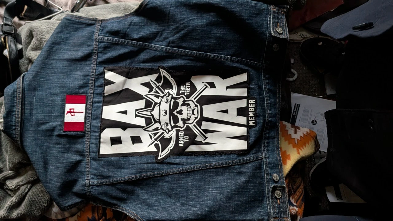 Dark wash denim vest with unique patches on the back and front. The patches feature a skull and crossbones design with the words "Battle Warriors" and "Armed to the Teeth". Great for adding some edge to your wardrobe!