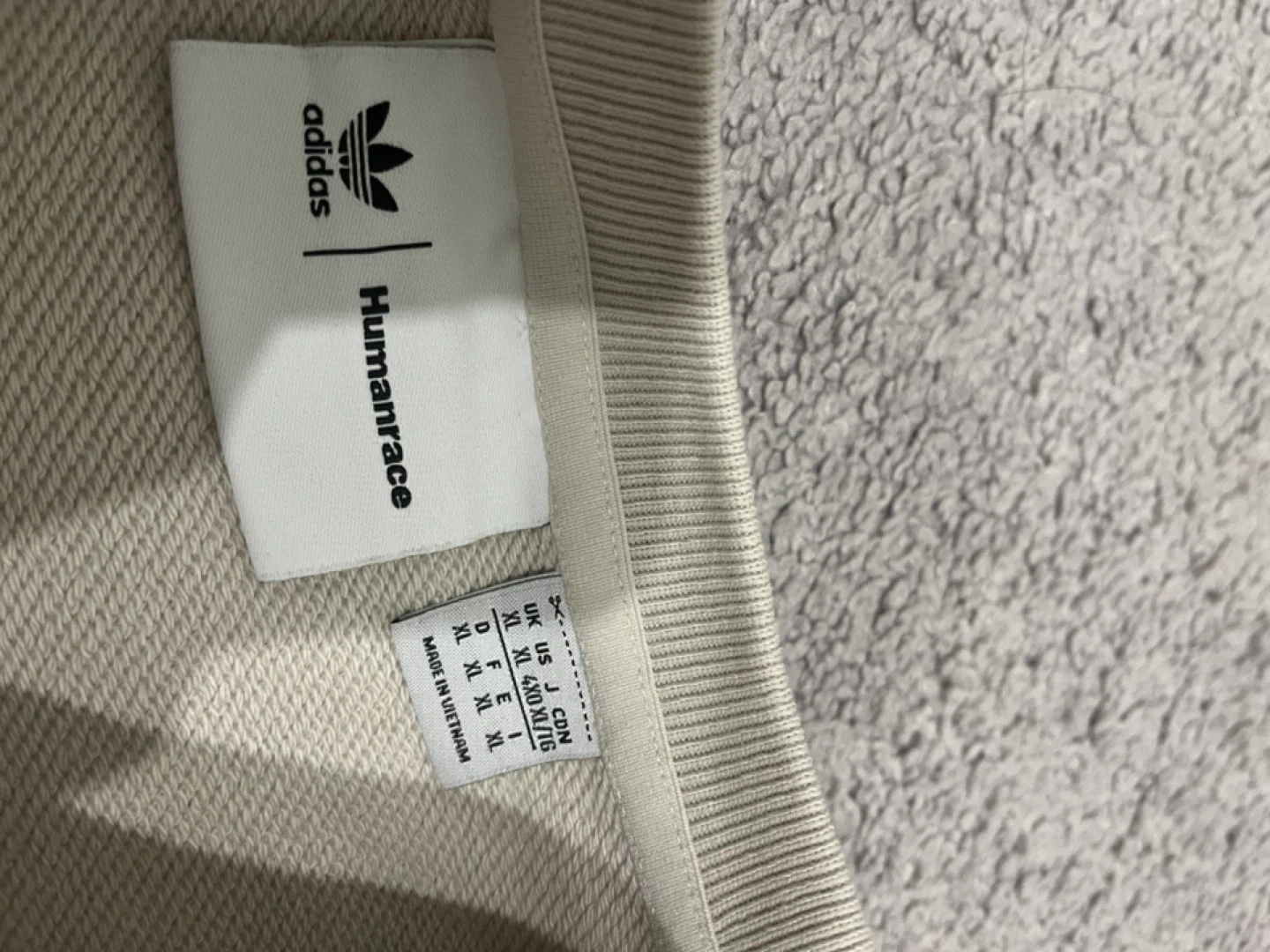 Selling an Adidas Humanrace sweatshirt in size XL. It's in great condition and ready for a new home! The colour is a neutral beige, and it features the 'Humanrace' logo across the front. Perfect for a casual, comfortable look
