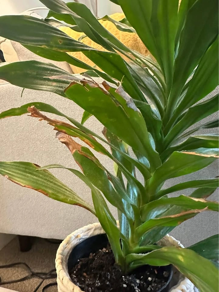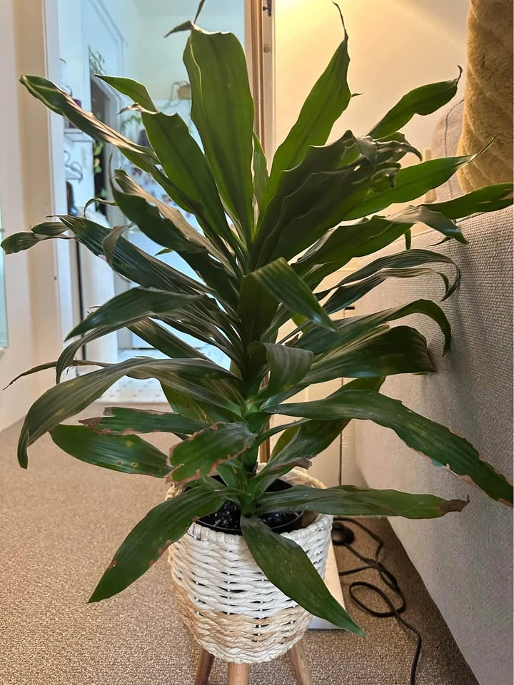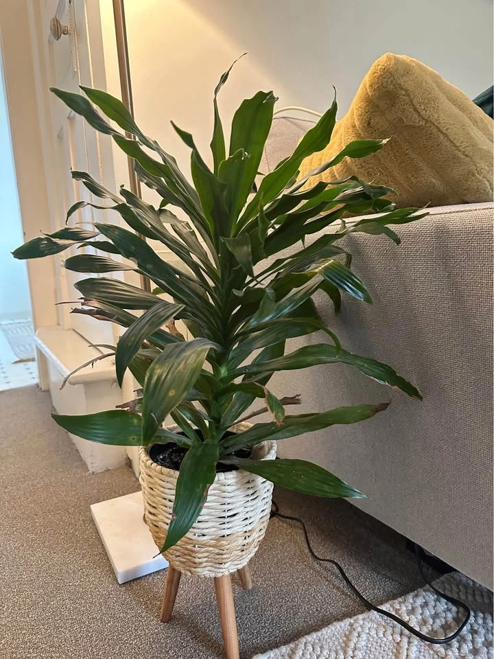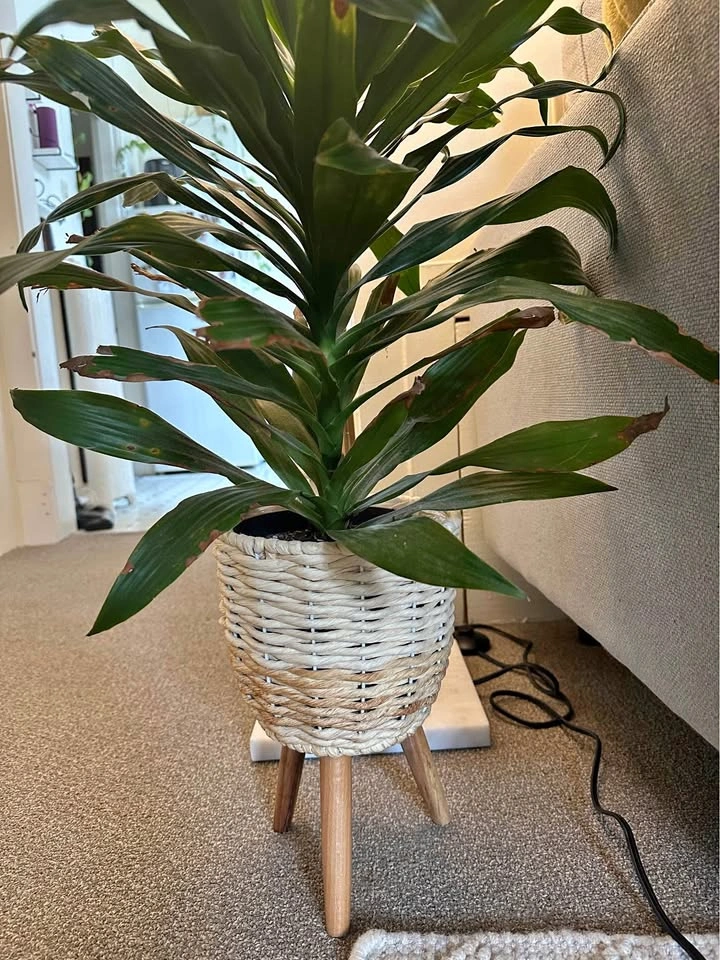 10Healthy Dracaena plant for sale β easy to care for Size: Medium floor plant, approx. 2.5 feet tall Pot/Stand: Comes with woven basket-style planter on wooden legs (some discoloration from water damage) Care: Low maintenance, does well in indirect light Condition: Plant is healthy overall, some leaf tips are browned (normal for this type) π Pickup in kits