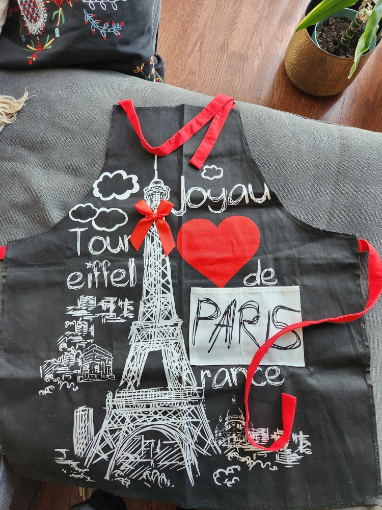 New black apron featuring the Eiffel Tower. Perfect for adding a touch of Parisian flair to your cooking or baking adventures.