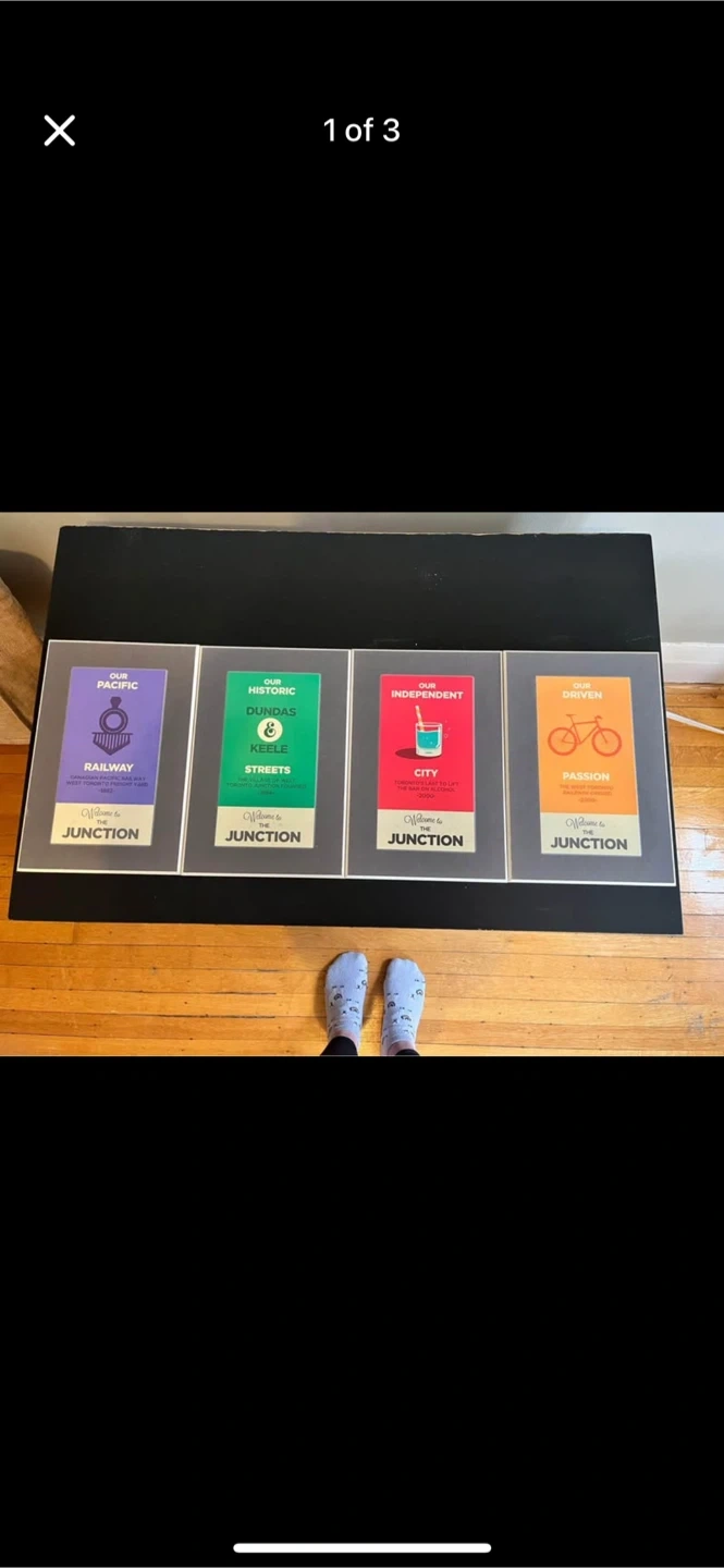 Selling a set of four framed art prints titled "Welcome to the Junction"! Each print represents a different aspect of the Junction neighbourhood: Pacific Railway, Historic Dundas & Keele Streets, Independent City, and Driven Passion. They're in great condition and would look lovely in any home