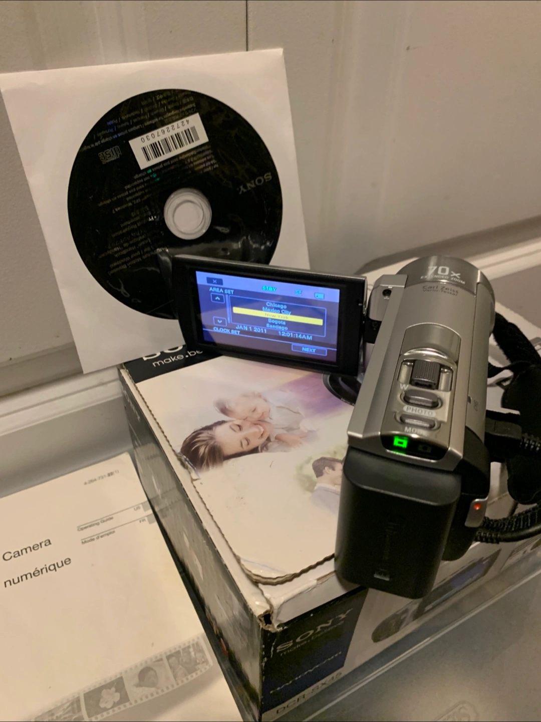 Capture your memories with this used Sony DCR-SX45 Handycam, a reliable digital video camera recorder. This camcorder is in good condition and comes with its original box, software, and manual, making it perfect for those looking to digitize old memories or create new ones.