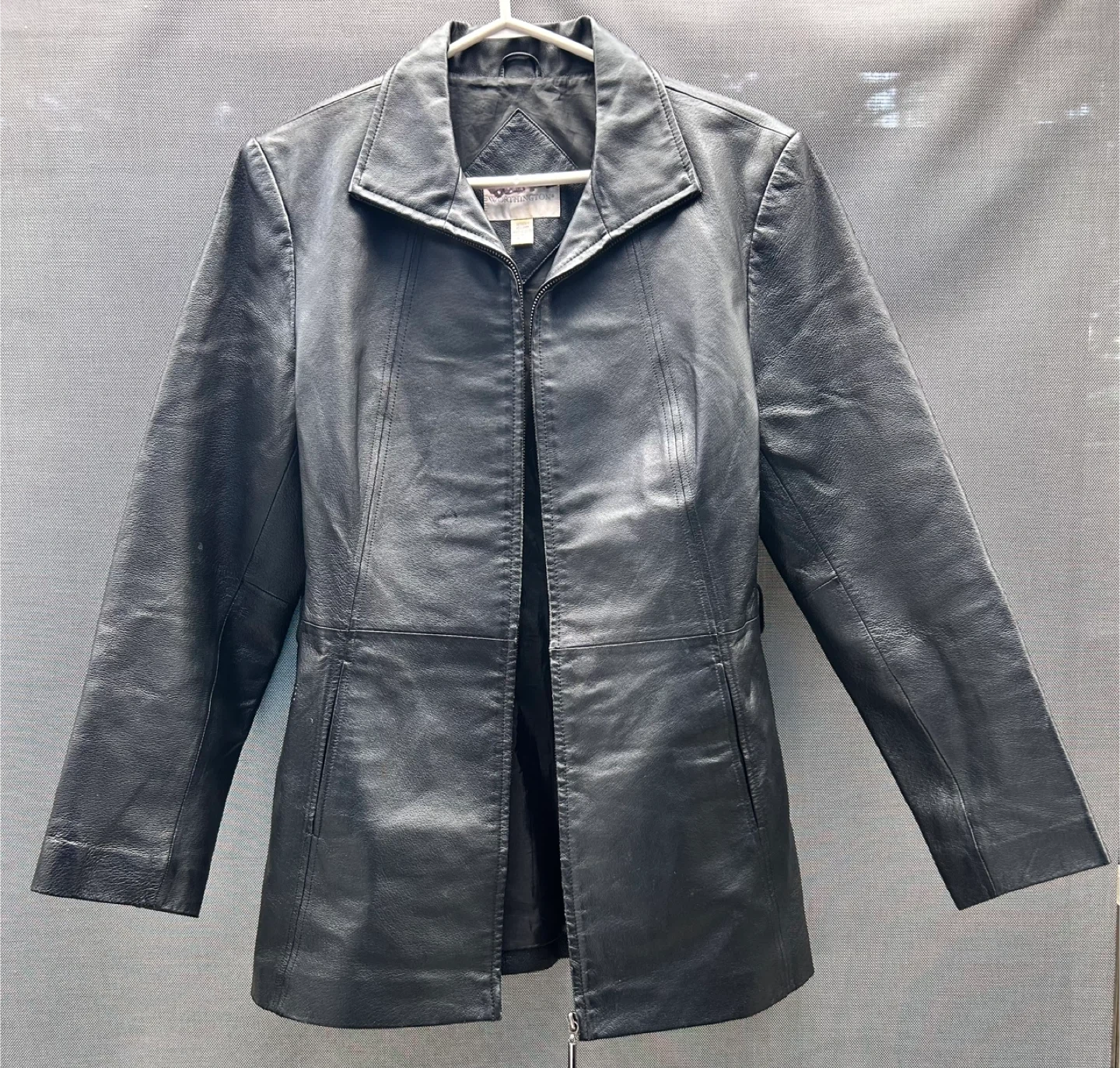 Selling a Worthington genuine lambskin leather jacket in size medium. It's a sleek black colour and in great condition! The tag indicates it should be professionally dry cleaned by a suede-life leather method.