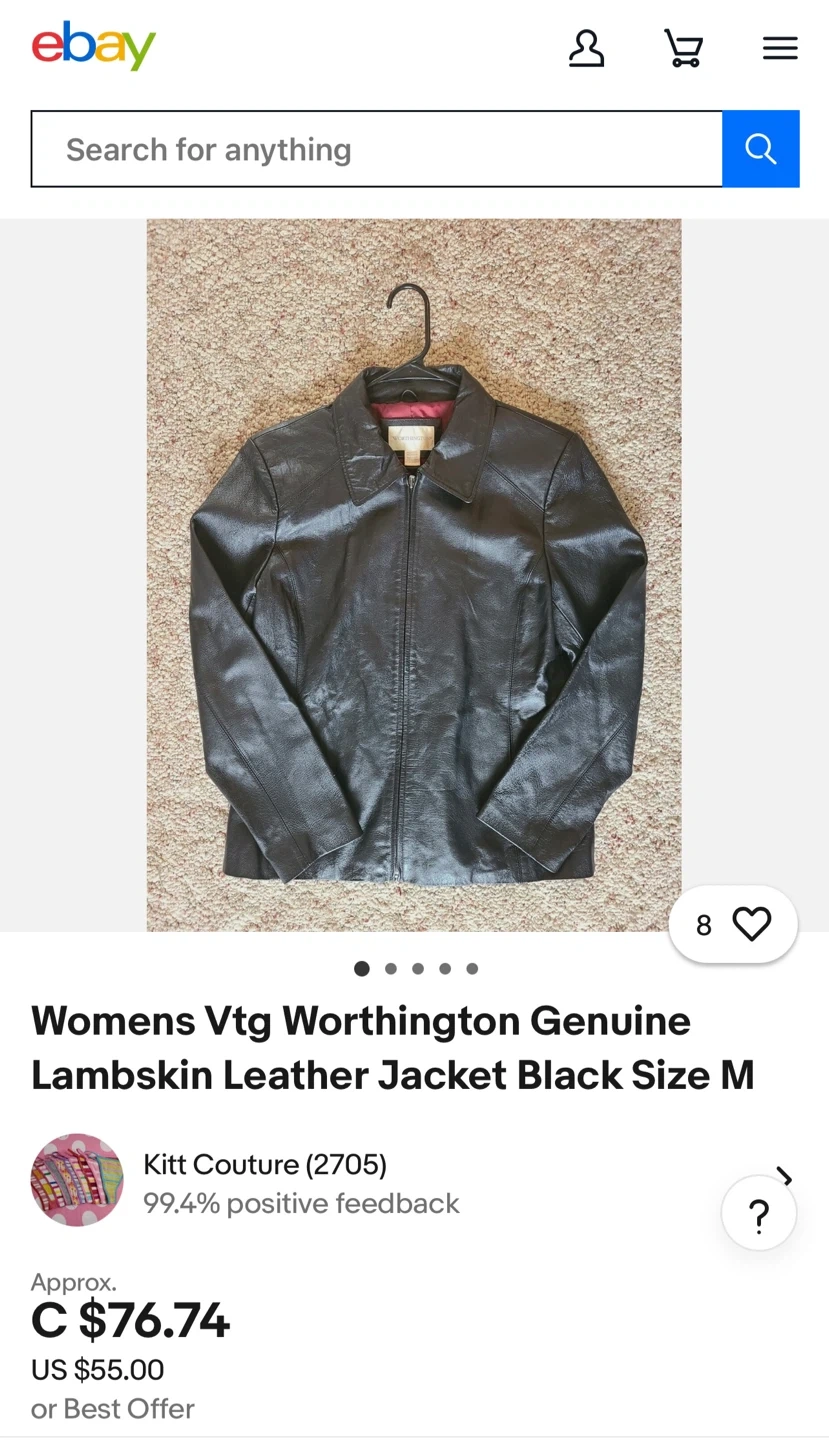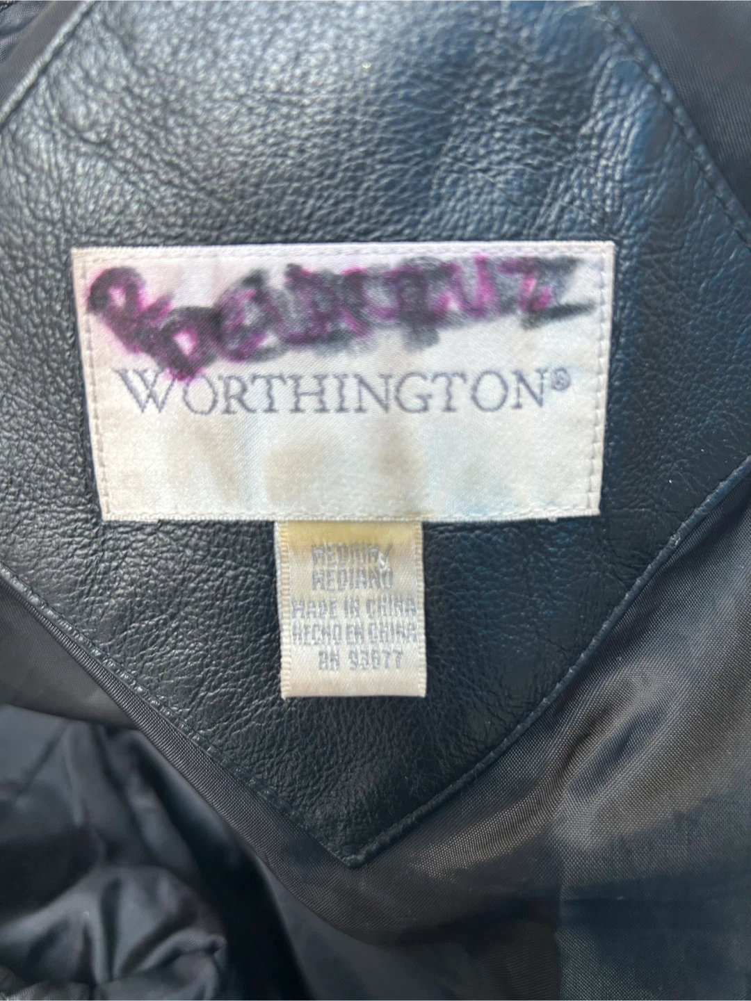 Selling a Worthington genuine lambskin leather jacket in size medium. It's a sleek black colour and in great condition! The tag indicates it should be professionally dry cleaned by a suede-life leather method.