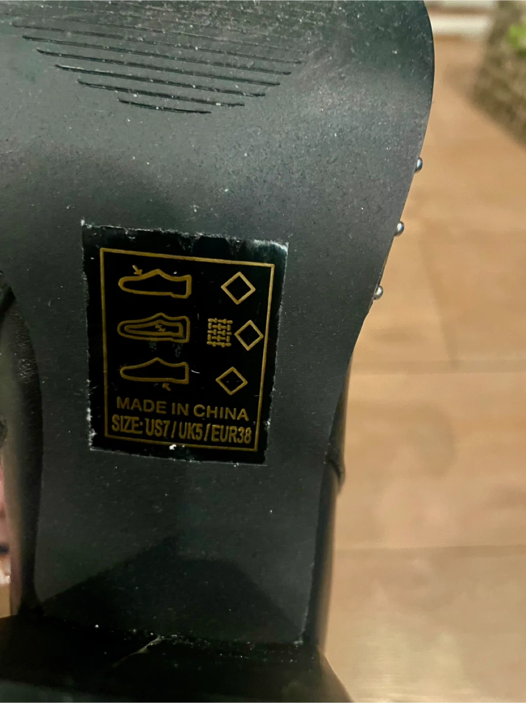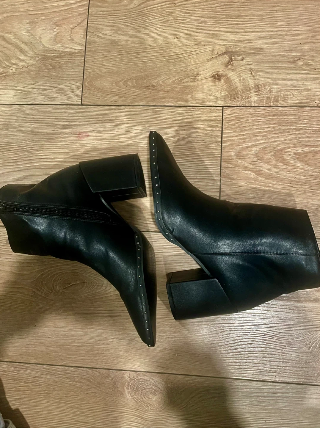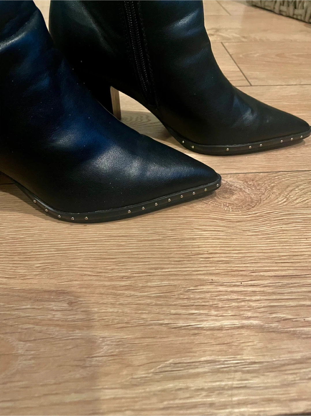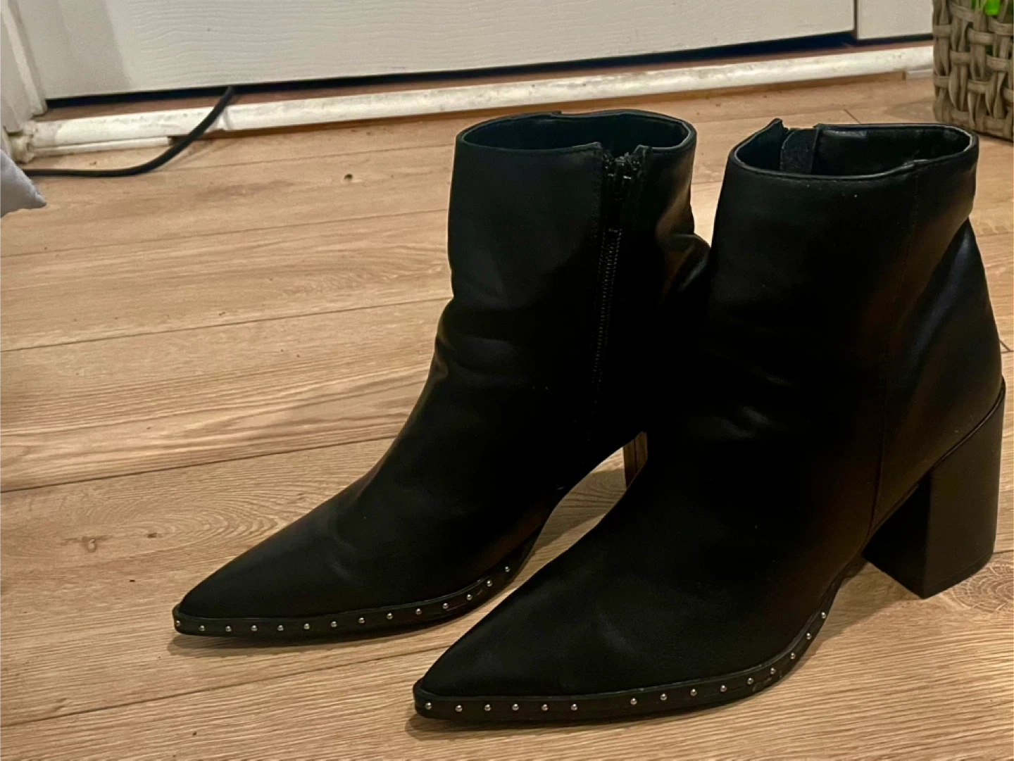 290Selling a pair of black ankle boots in good condition. They have a pointed toe and a block heel, perfect for dressing up or down! They feature a side zipper for easy on and off, and subtle stud detailing along the sole. They are missing silver bideds, very clear to see on picture.
