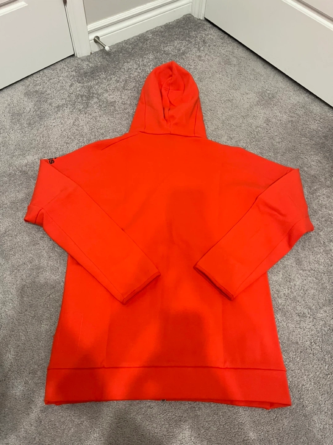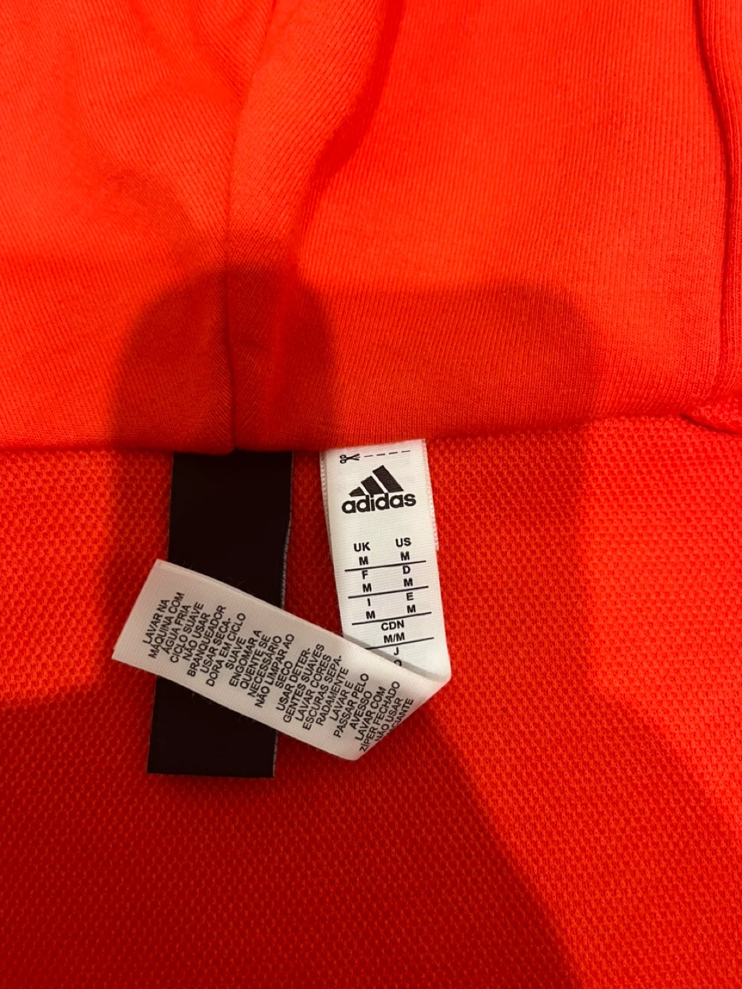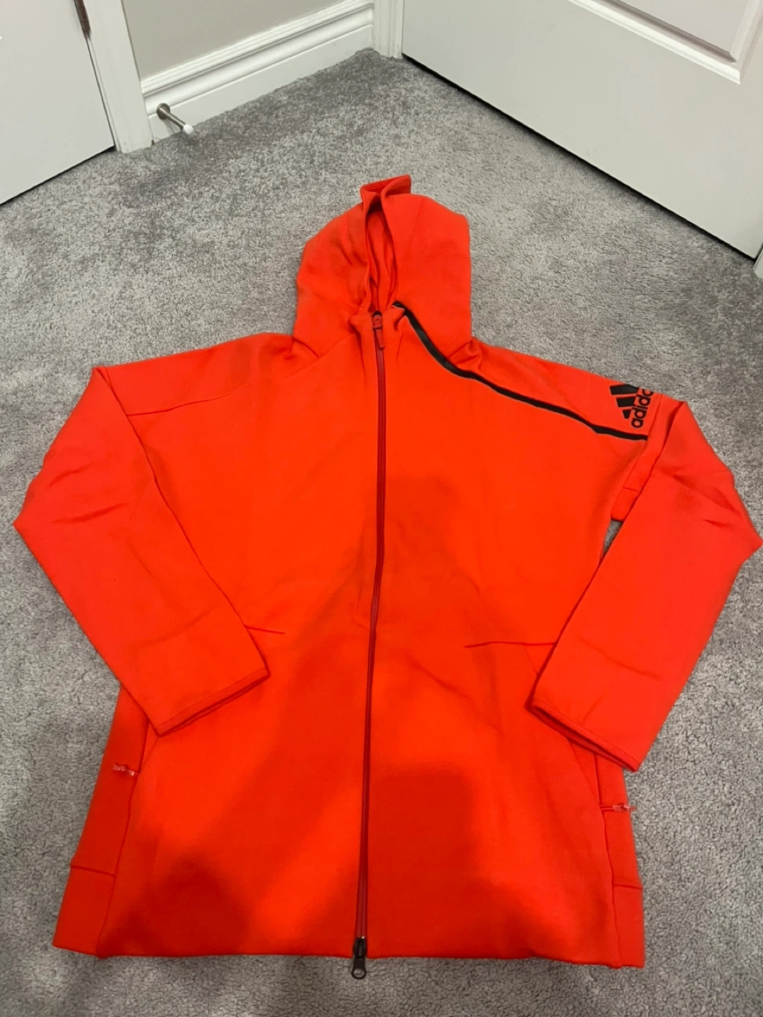 Selling an Adidas Z.N.E. full-zip hoodie in size medium. It's a vibrant orange colour and in great condition. Perfect for workouts or just lounging around!