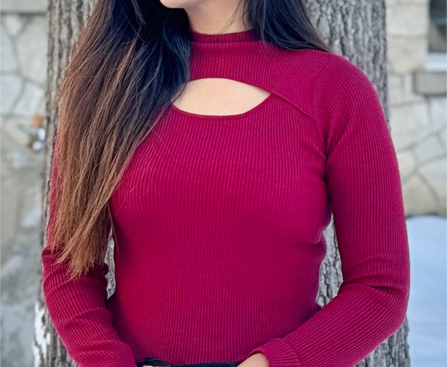 10Selling a cute burgundy long sleeve top! It has a unique cut-out detail at the neckline and a ribbed texture. Perfect for layering or wearing on its own!