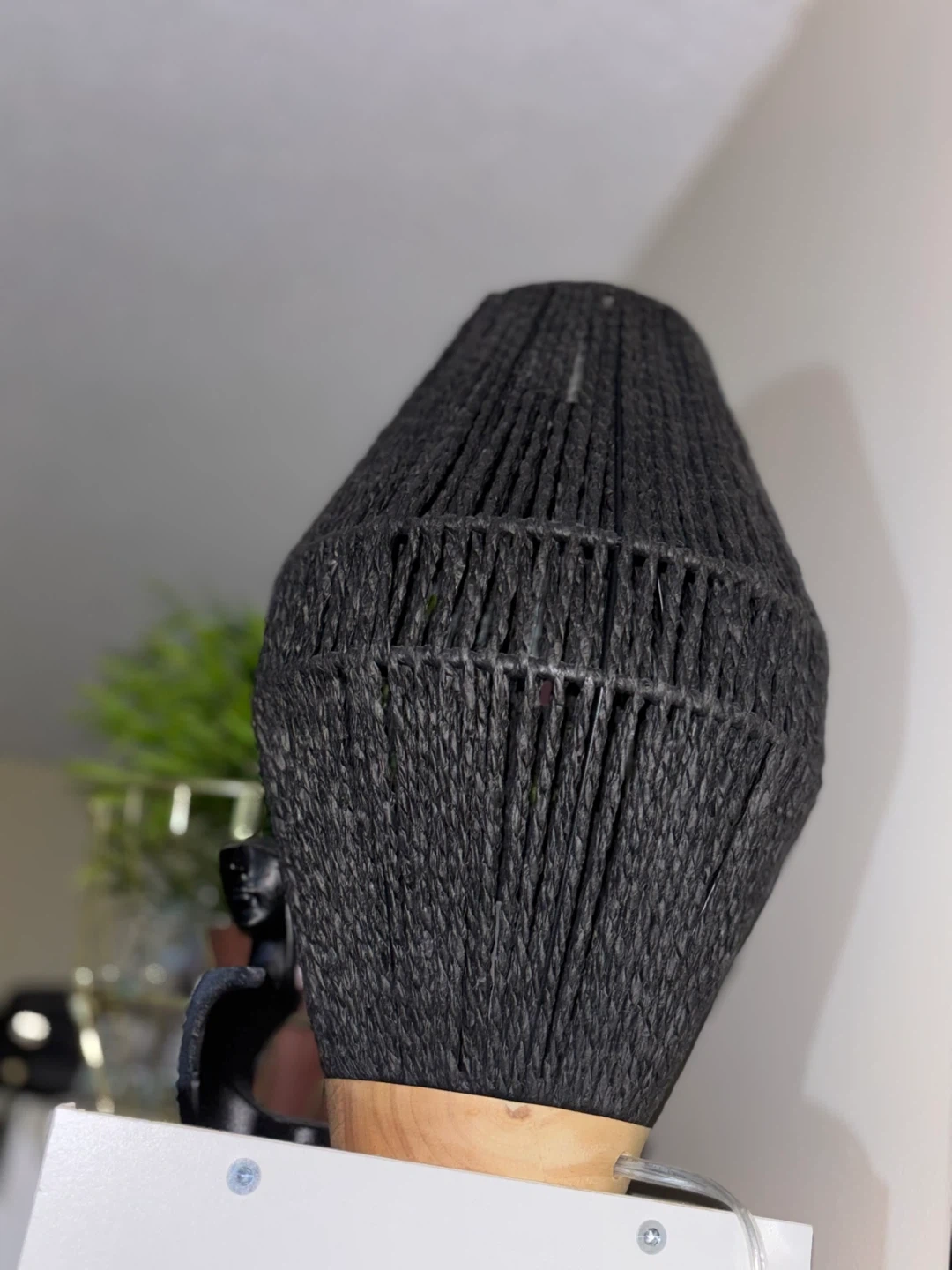 Selling a stylish black woven table lamp! It's in great condition and would add a nice touch to any room. The base is a light wood colour, which complements the black shade nicely.