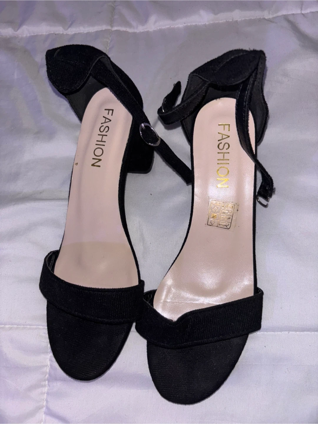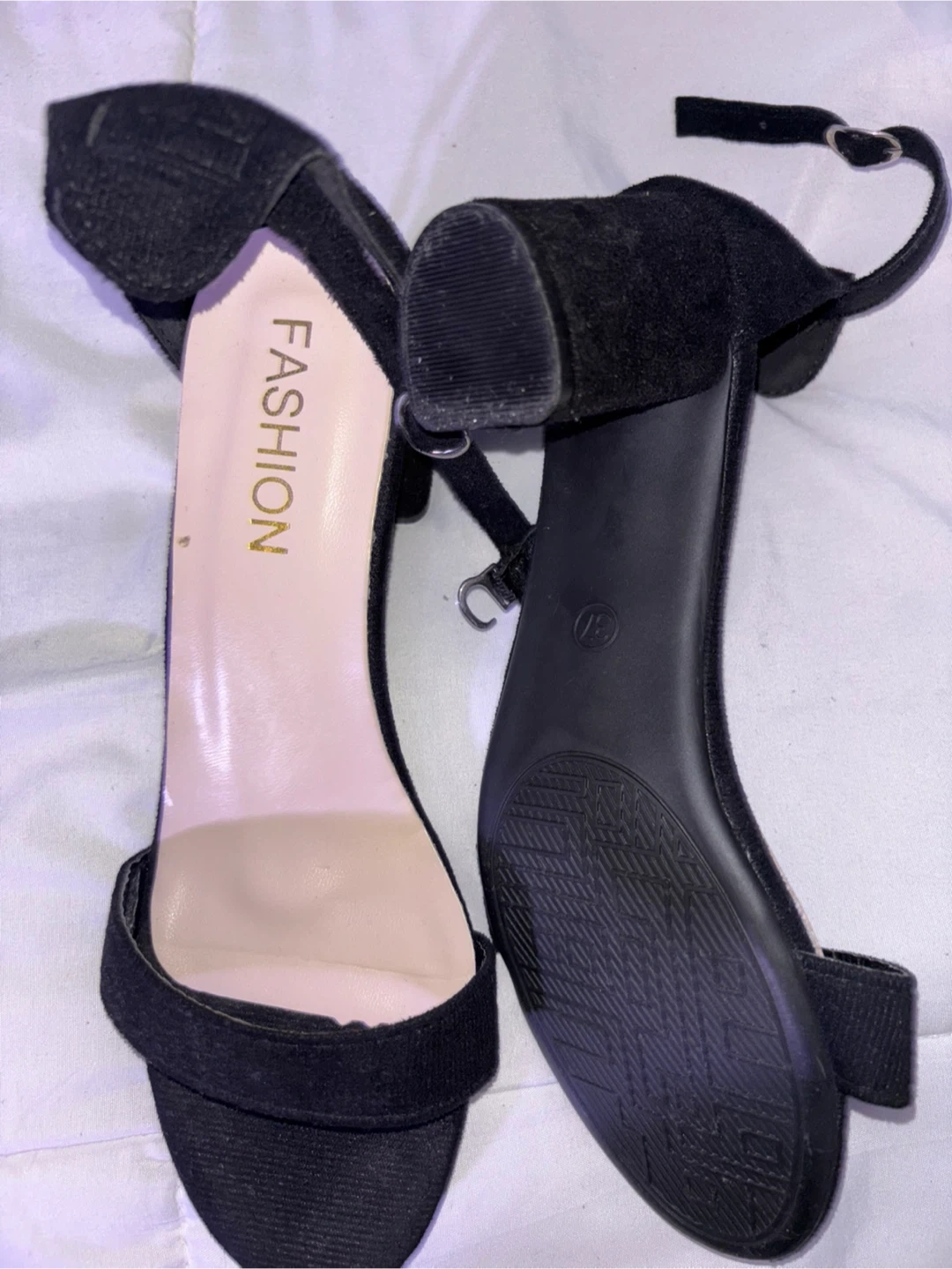 Selling a pair of black heels in size 8. They have a fashionable design and are in good condition. Perfect for a night out!