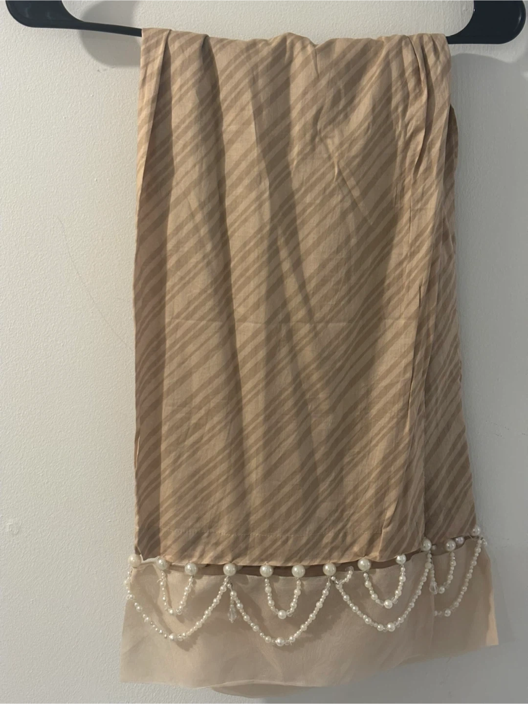 These are a pair of beige pants with a subtle striped pattern. They feature a delicate pearl detailing along the bottom hem, adding a touch of elegance to the design. They are in good condition and ready for a new home!