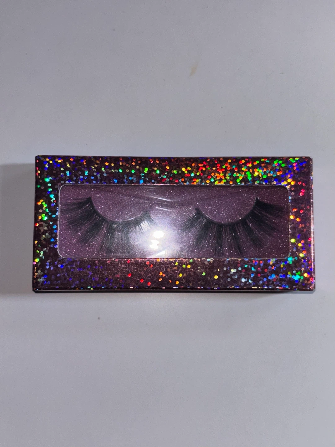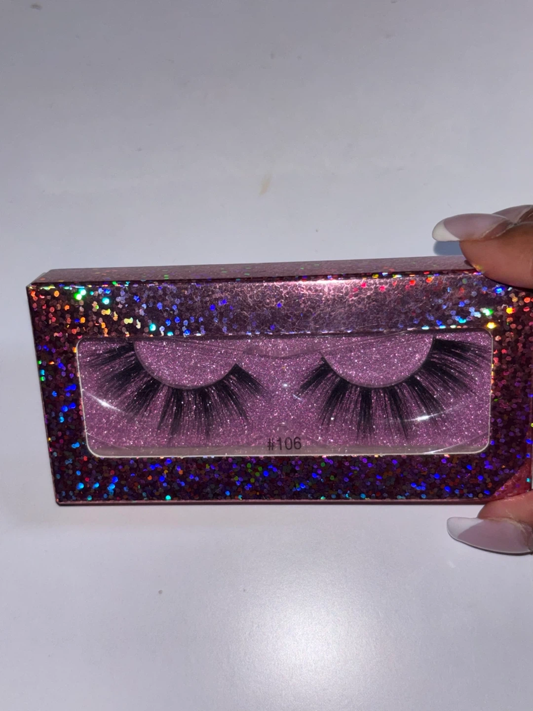Selling a pair of false eyelashes, style #106. They come in a sparkly pink box and are ready to enhance your look! Custom lashes.