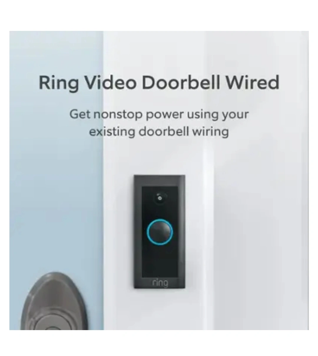 65Ring Wi-Fi Video Doorbell - Wired - Black Features Amazon AlexaRingRing HD video and two-way talk With 1080p HD video and two-way talk, see, hear, and speak to people from your phone, tablet, or select Alexa-enabled devices. Chime In-Home Connect to Ring Chime to hear audio notifications throughout your home (sold separately). Note: the doorbell will not sound your existing chime. Note: the doorbell will not sound on existing home wired chime. Advanced motion detection Customize your motion zone settings to focus on areas you need to protect. Wiring Comes hardwired using existing doorbell wiring for nonstop power. Quick Replies Quick Replies let you answer the door with preset responses, or save time and ask visitors to leave a message with just a few taps. Ring Protect subscription required, sold separately, to access and review the Quick Replies recordings. Package Alerts Know when a package is delivered with Package Alerts, an exclusive Ring Home subscription feature (sold separately) that notifies you when your package is detected within a specified zone.* Night Vision Night vision with sharp contrast lets you monitor what matters most – day or night. Alexa Works with Alexa so you can hear audio announcements when anyone presses the doorbell or triggers the motion NEW With WARRANTY EASY FINANCING AVAILABLE