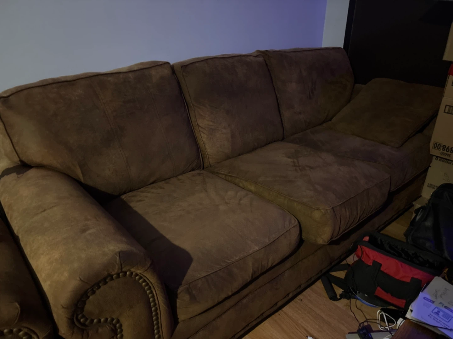 Selling a comfy brown sofa with a suede-like texture. It's perfect for lounging and adding a warm touch to your living room. It shows some signs of use.