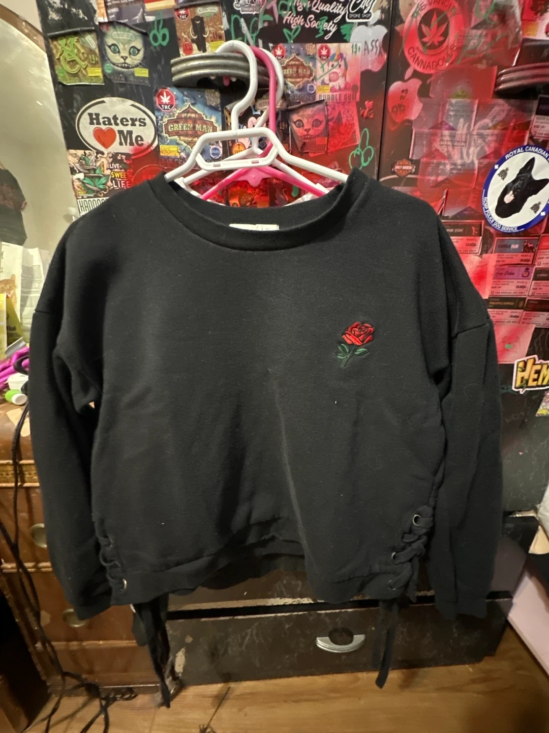 Selling a cute black sweatshirt with a rose embroidery detail. It has a unique lace-up design on the sides. It's in good condition and ready for a new home!