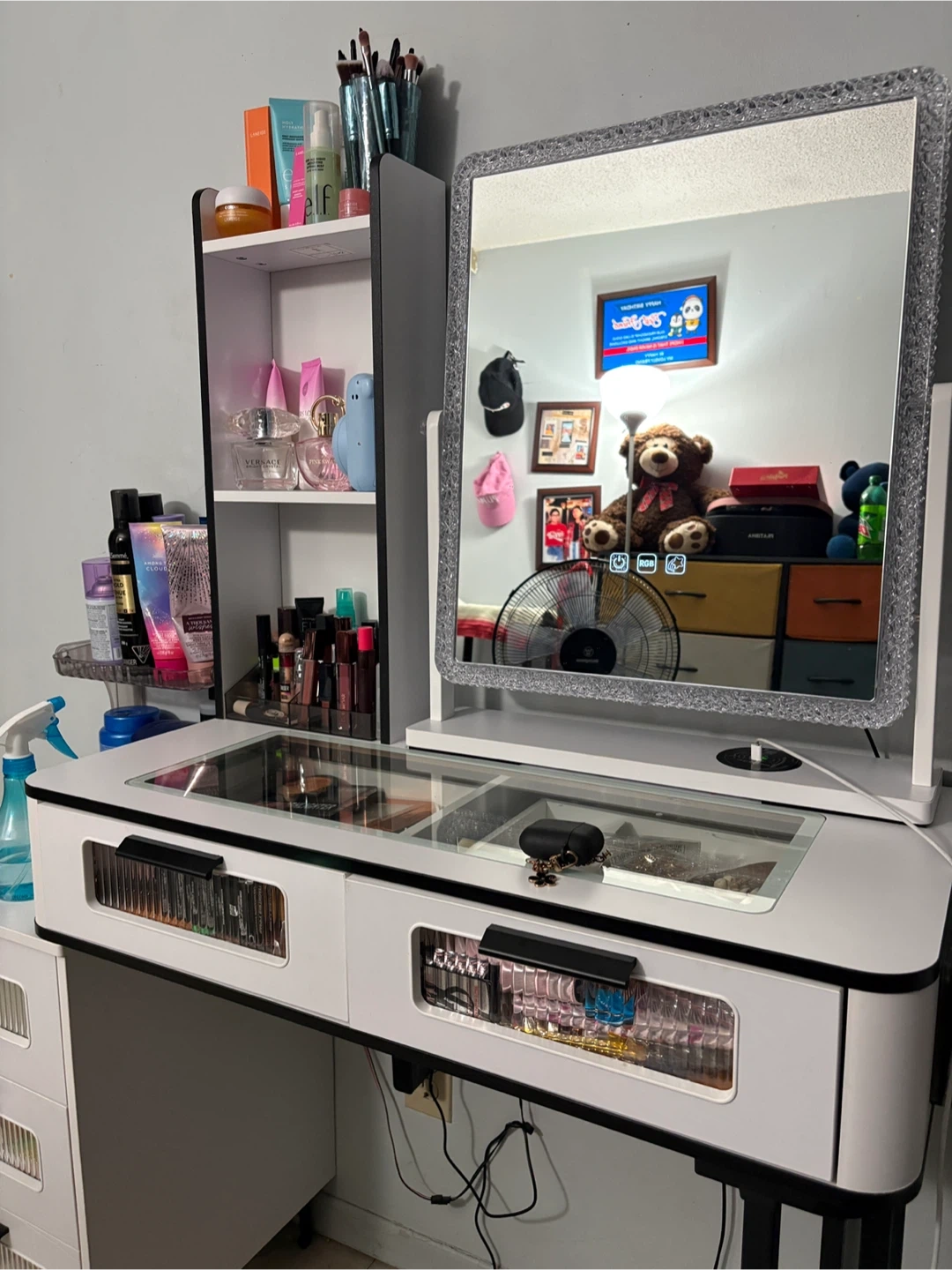 10Elegant and fully functional vanity set featuring a large LED light mirror, built-in wireless charging port, and comfortable sitting stool. The mirror includes touch controls with adjustable lighting modes, perfect for makeup, skincare, or hairstyling. The vanity offers spacious drawers and side shelving for organized storage of beauty products and accessories. • LED mirror with adjustable brightness and color settings (touch control) • Built-in wireless charging port for easy phone charging • Comes with a matching cushioned stool • Multiple drawers and open shelves for ample storage • Sleek modern design with white and black finish • Sturdy and in excellent condition Condition: Gently used, fully functional Includes: Vanity table, LED mirror, side shelves, wireless charging port, and stool