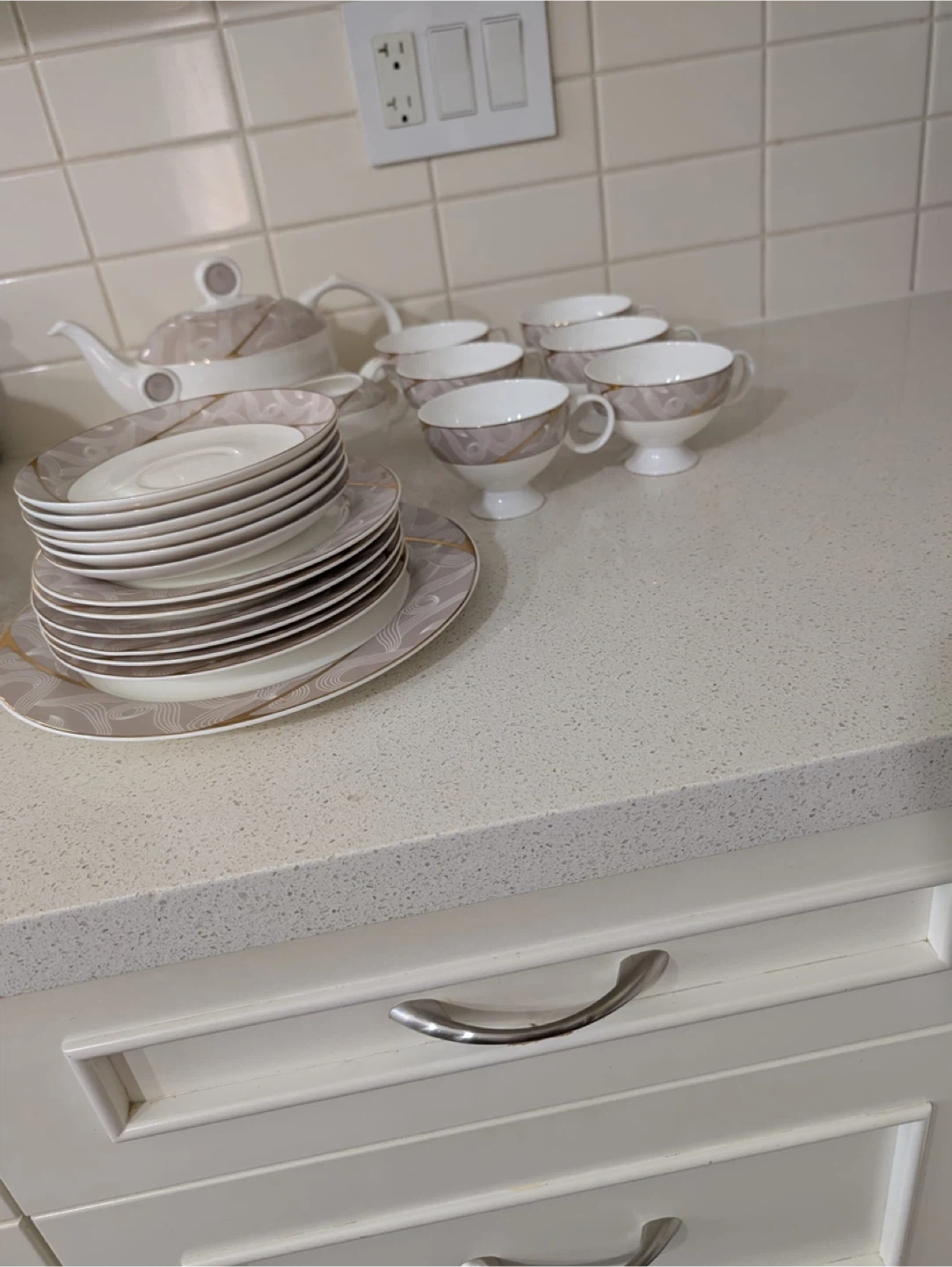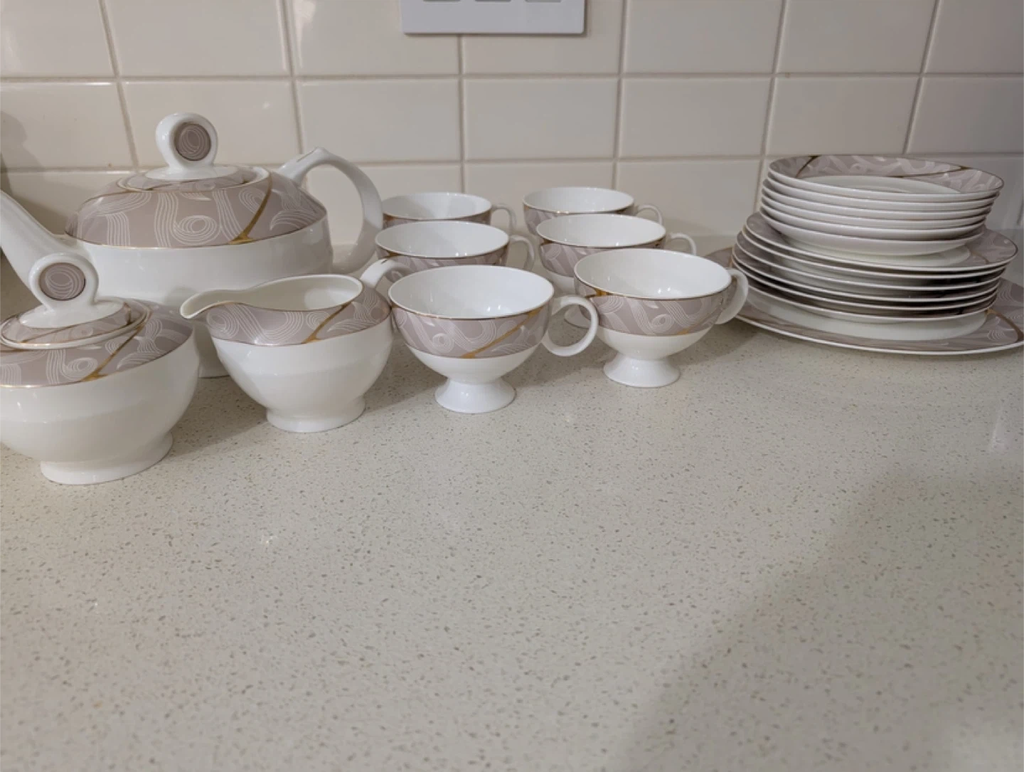 Selling a beautiful tea set! Includes a teapot, creamer, sugar bowl, six cups, and a stack of saucers. The set features a lovely neutral colour palette with gold accents, perfect for adding a touch of elegance to your tea time
