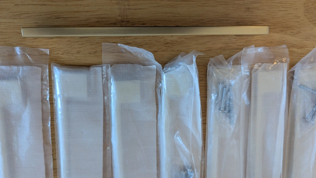 Set of 9 Southern Hills brushed gold cabinet pulls. These are 6.25 inches in length with 5" screw spacing. Each pull comes individually wrapped with screws included. Perfect for updating kitchen cabinets or dresser drawers!