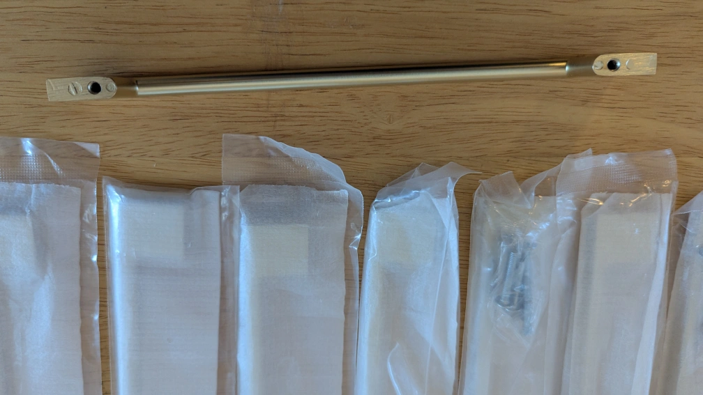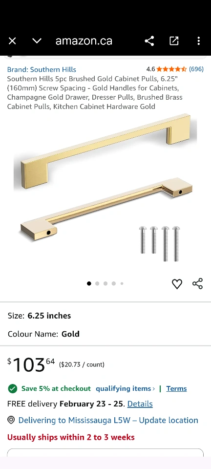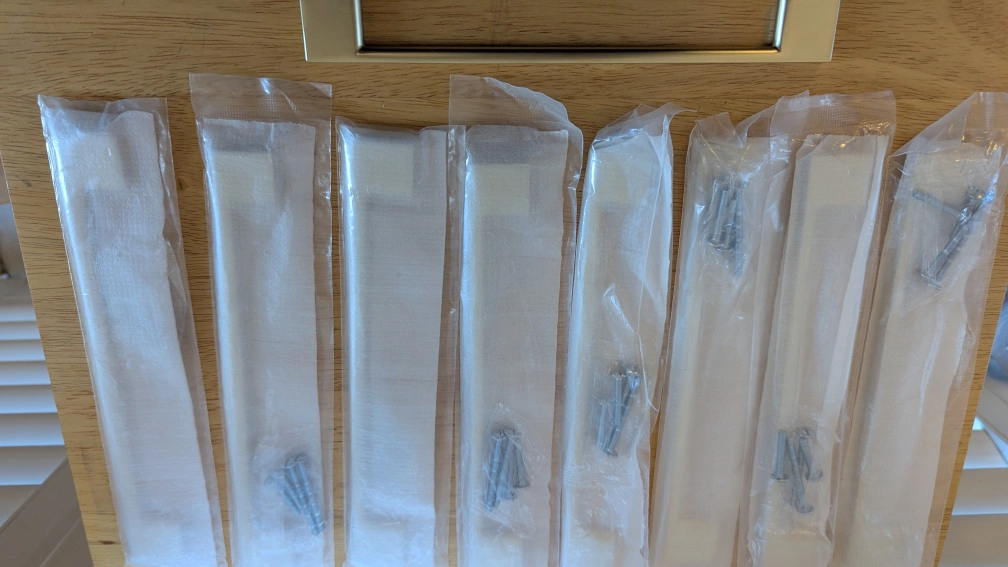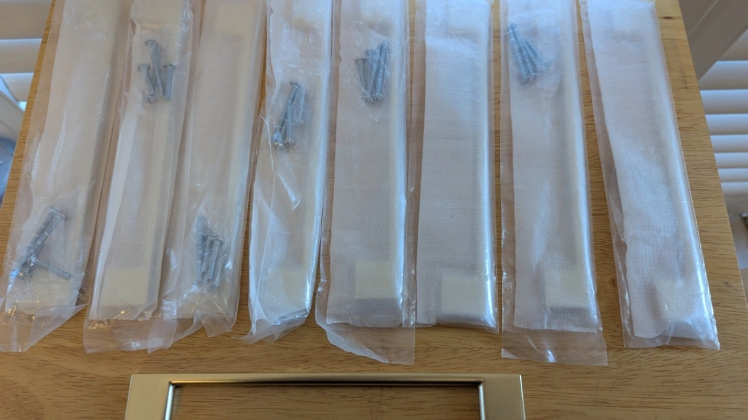 Set of 9 Southern Hills brushed gold cabinet pulls. These are 6.25 inches in length with 5" screw spacing. Each pull comes individually wrapped with screws included. Perfect for updating kitchen cabinets or dresser drawers!