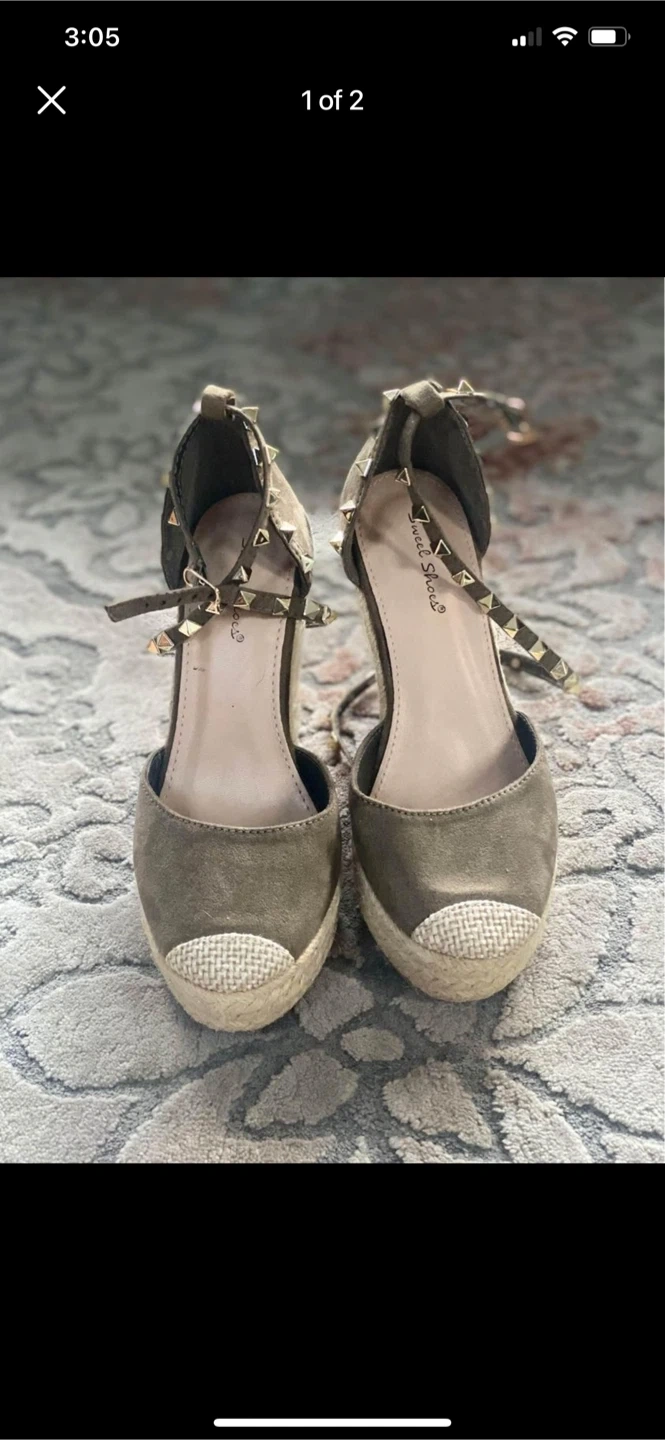 10Cute olive green wedge heels from Italy , size 37EU. They feature a stylish espadrille wedge and studded detailing. Perfect for adding a bit of flair to your summer outfits!