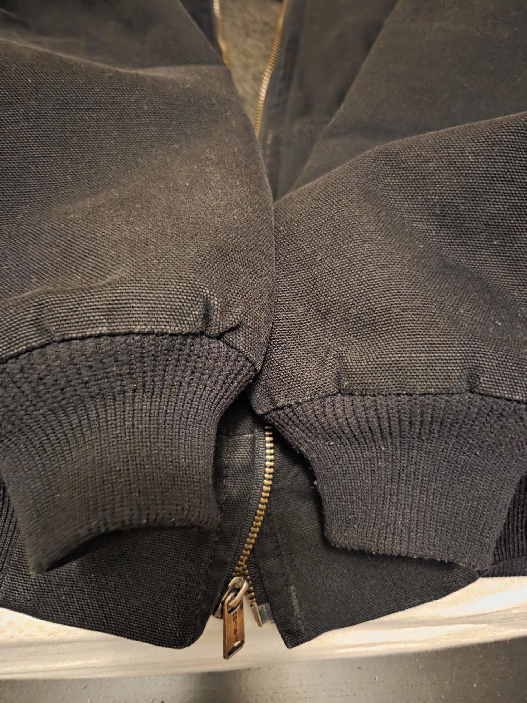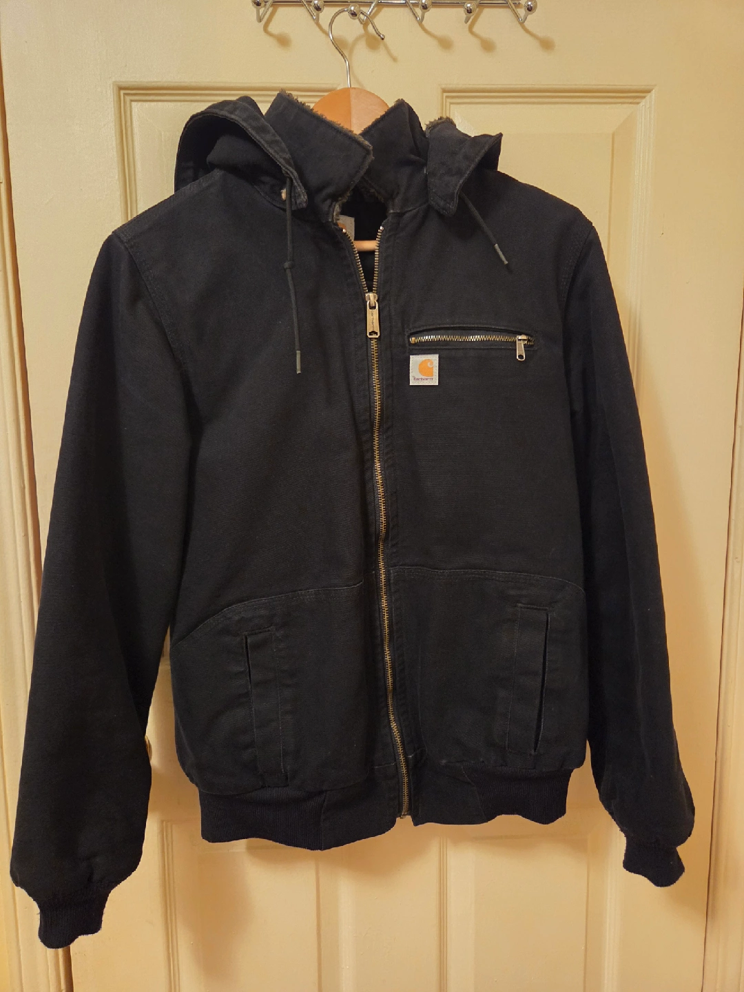 Cozy black Carhartt hooded jacket, perfect for those chilly days! It features a warm, sherpa-style lining, detachable hood and a durable outer shell. Size is M.