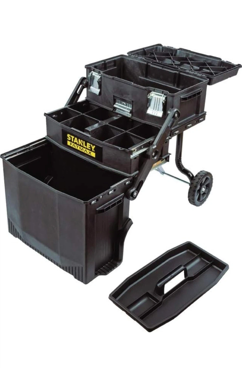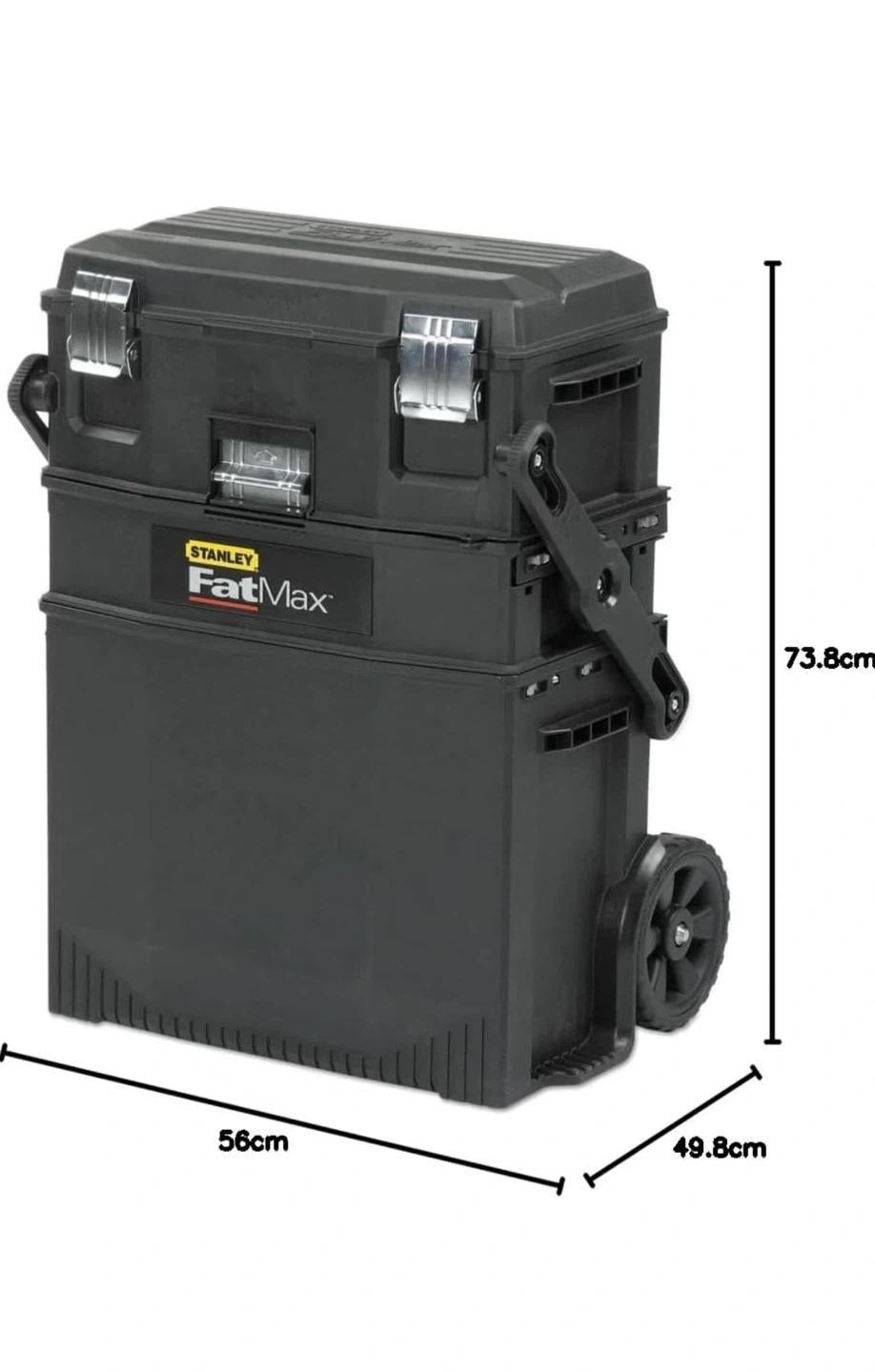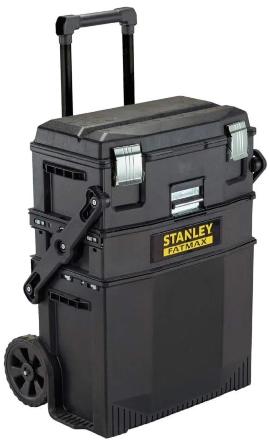 Selling a Stanley FatMax rolling tool box. It has a sturdy design with wheels for easy transport. Dimensions are approximately 56cm x 49.8cm x 73.8cm. Perfect for keeping your tools organized and mobile!