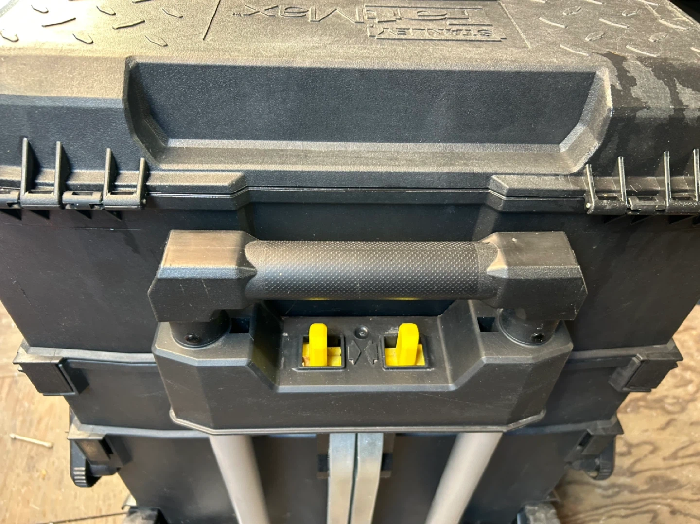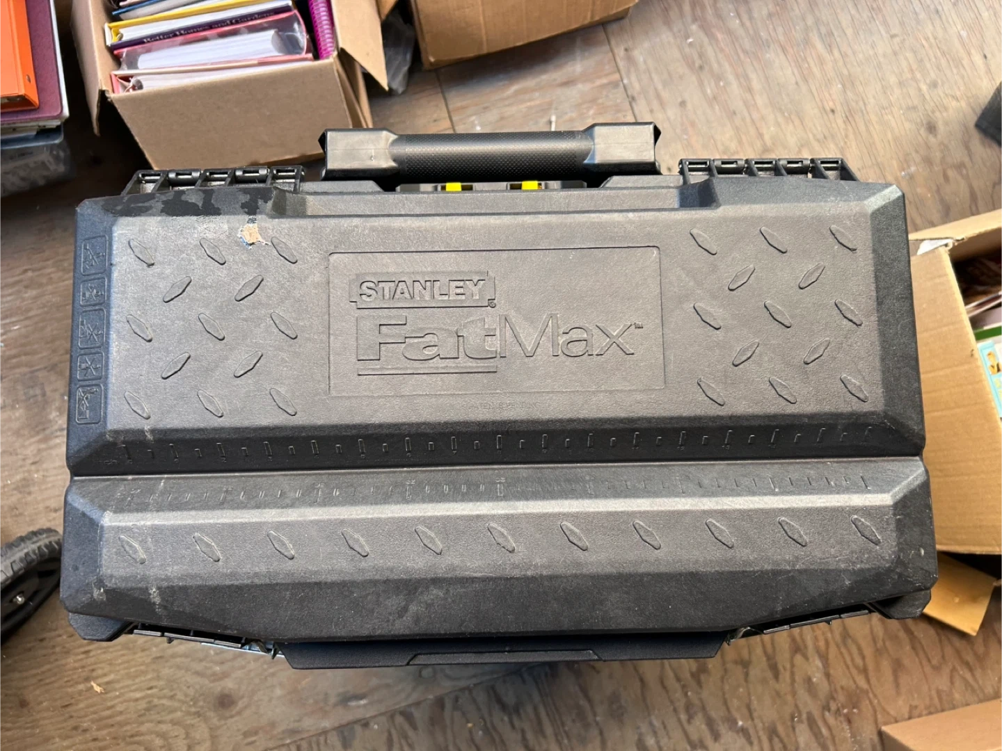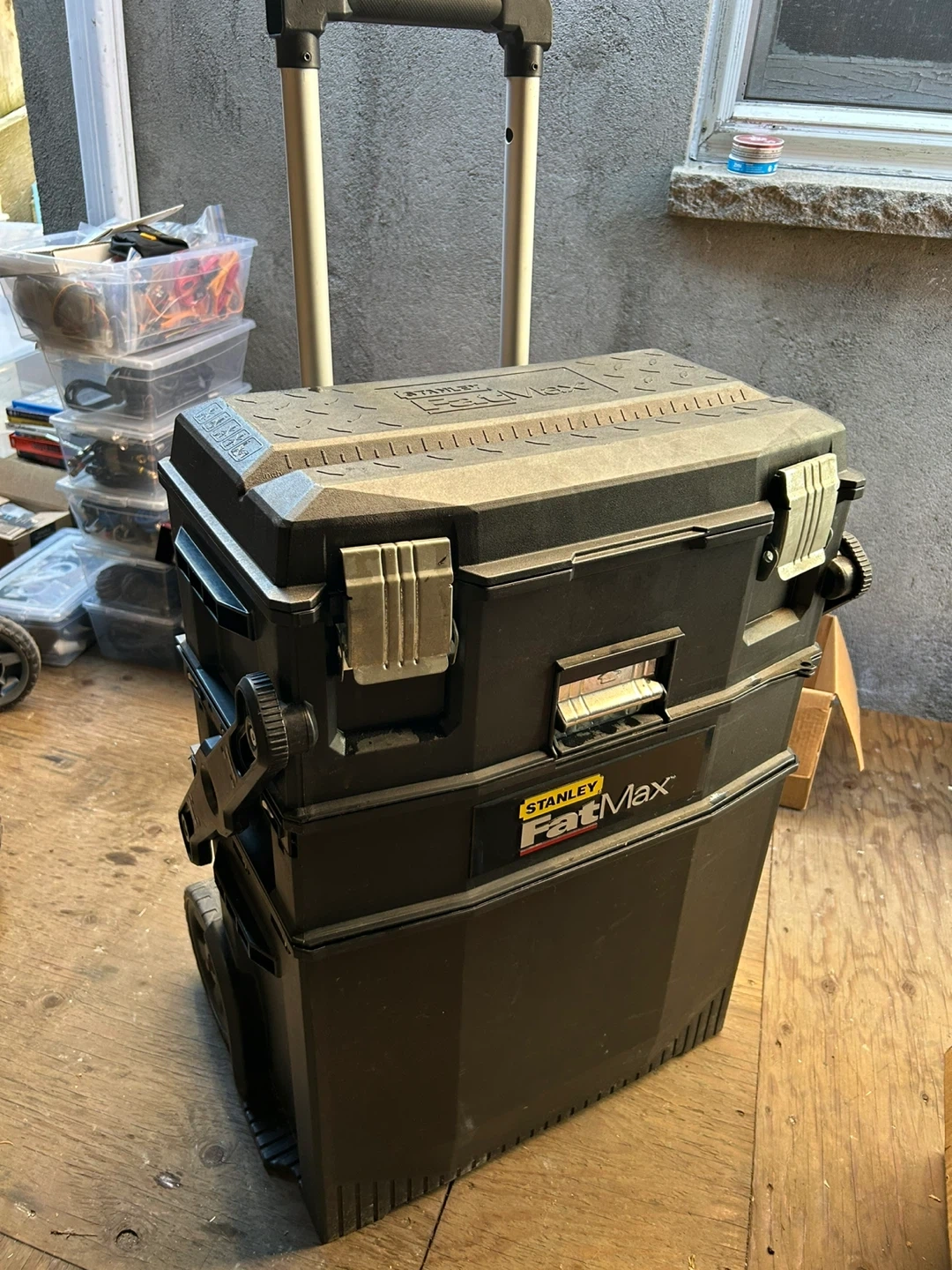 Selling a Stanley FatMax rolling tool box. It has a sturdy design with wheels for easy transport. Dimensions are approximately 56cm x 49.8cm x 73.8cm. Perfect for keeping your tools organized and mobile!