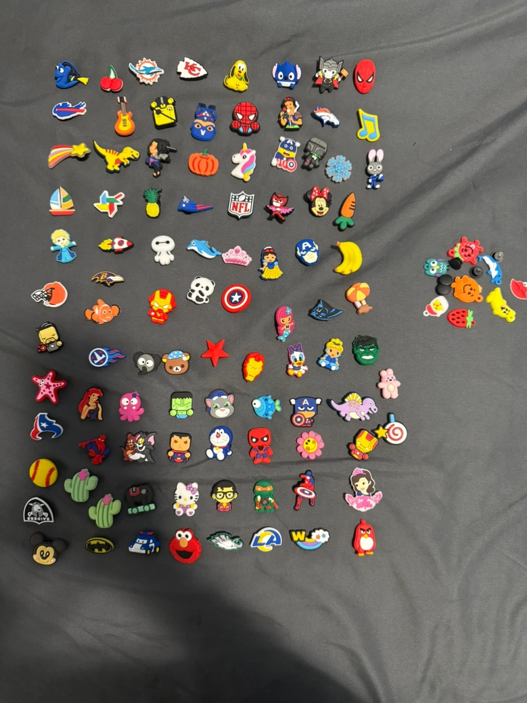 Selling a big lot of Crocs Jibbitz charms! There are over 70 charms, featuring a variety of characters and designs. Great for adding some fun and personality to your Crocs!