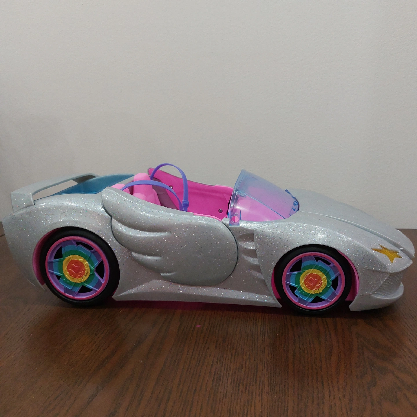 Selling a Barbie Extra Car. It's in great condition and ready for a new home! It's a fun, glittery silver colour with pink interior, wing doors and rainbow wheels