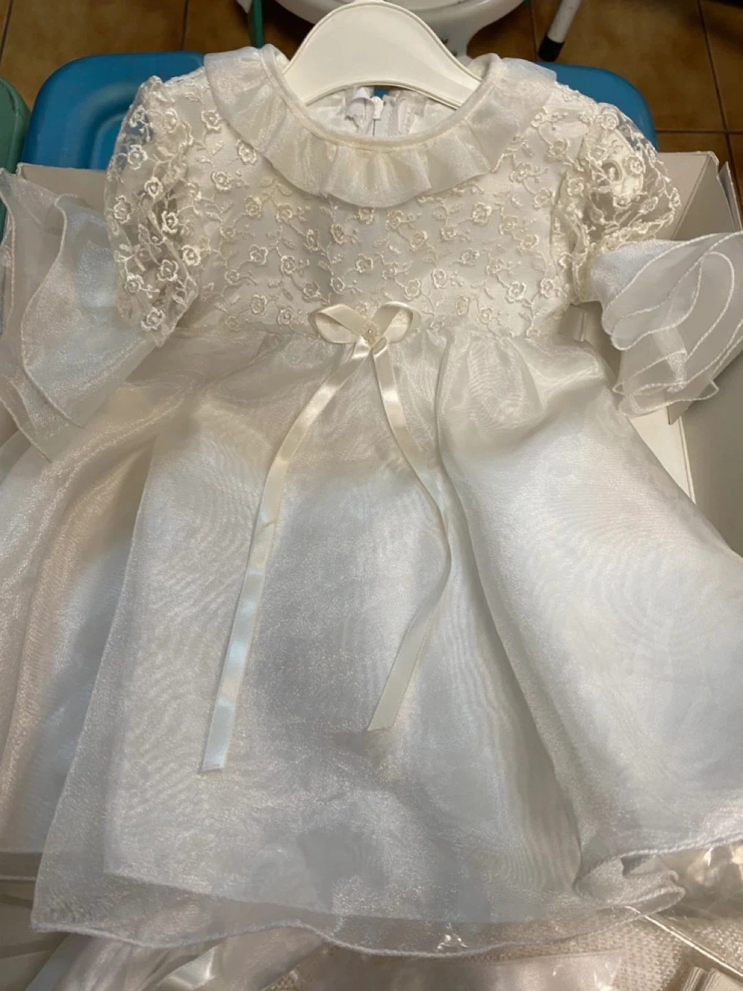 This is a complete Baptism outfit set for Baby Girl. Includes the dress, the shoes, the Hat, Matching socks, Bib, and Blanket. Used only once. Small stain on bow of dress. Needs a wash.