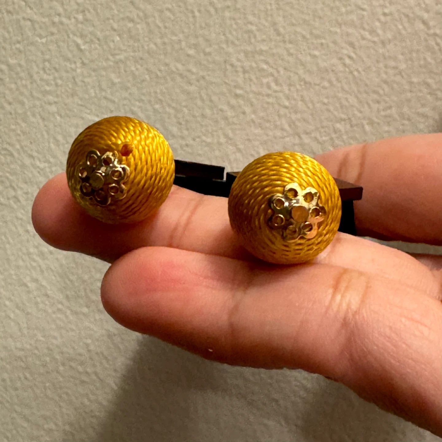 Selling a pair of gold tone mustard yellow thread ball earrings. They have a woven texture and dangle design on the front. They are in good condition and ready for a new home.