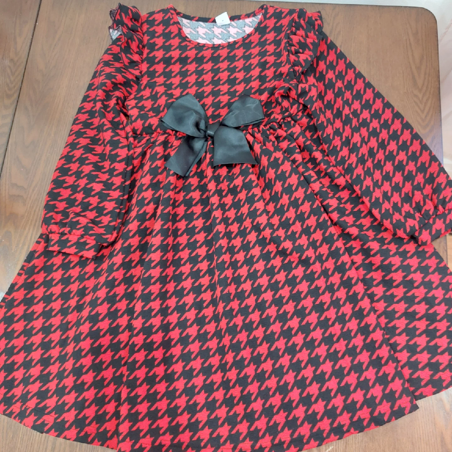 Cute red and black houndstooth long-sleeve dress with a black bow. Perfect for a party or special occasion! Worn twice.