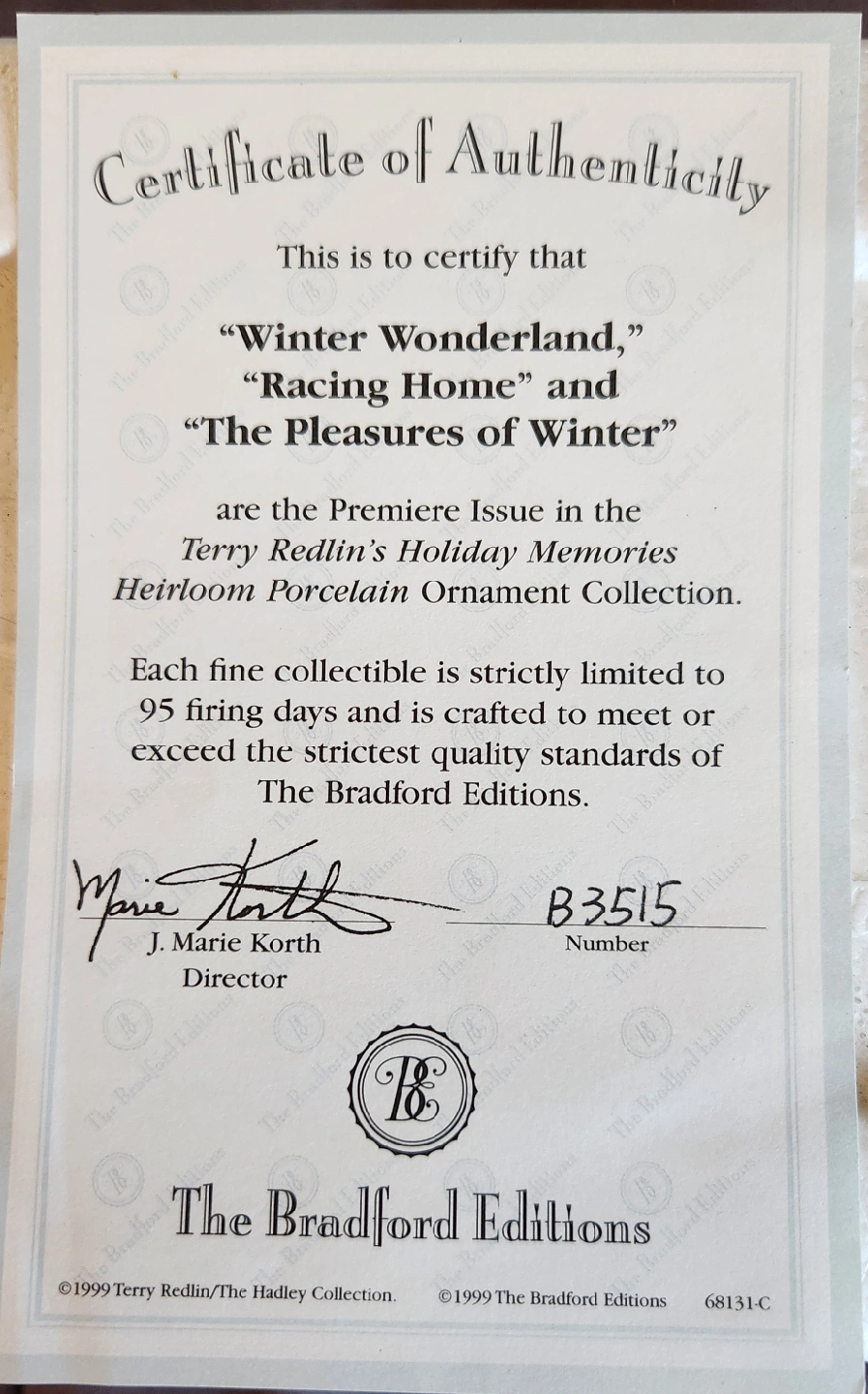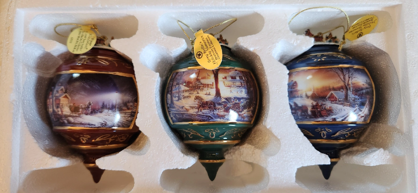 Selling a set of three ornaments from the Bradford Editions Terry Redlin's Holiday Memories Heirloom Porcelain Ornament Collection. The set includes "Winter Wonderland," "Racing Home," and "The Pleasures of Winter." They are the Premiere Issue and come with a Certificate of Authenticity. These fine collectibles are strictly limited edition. Comes with the original box. Brand new.