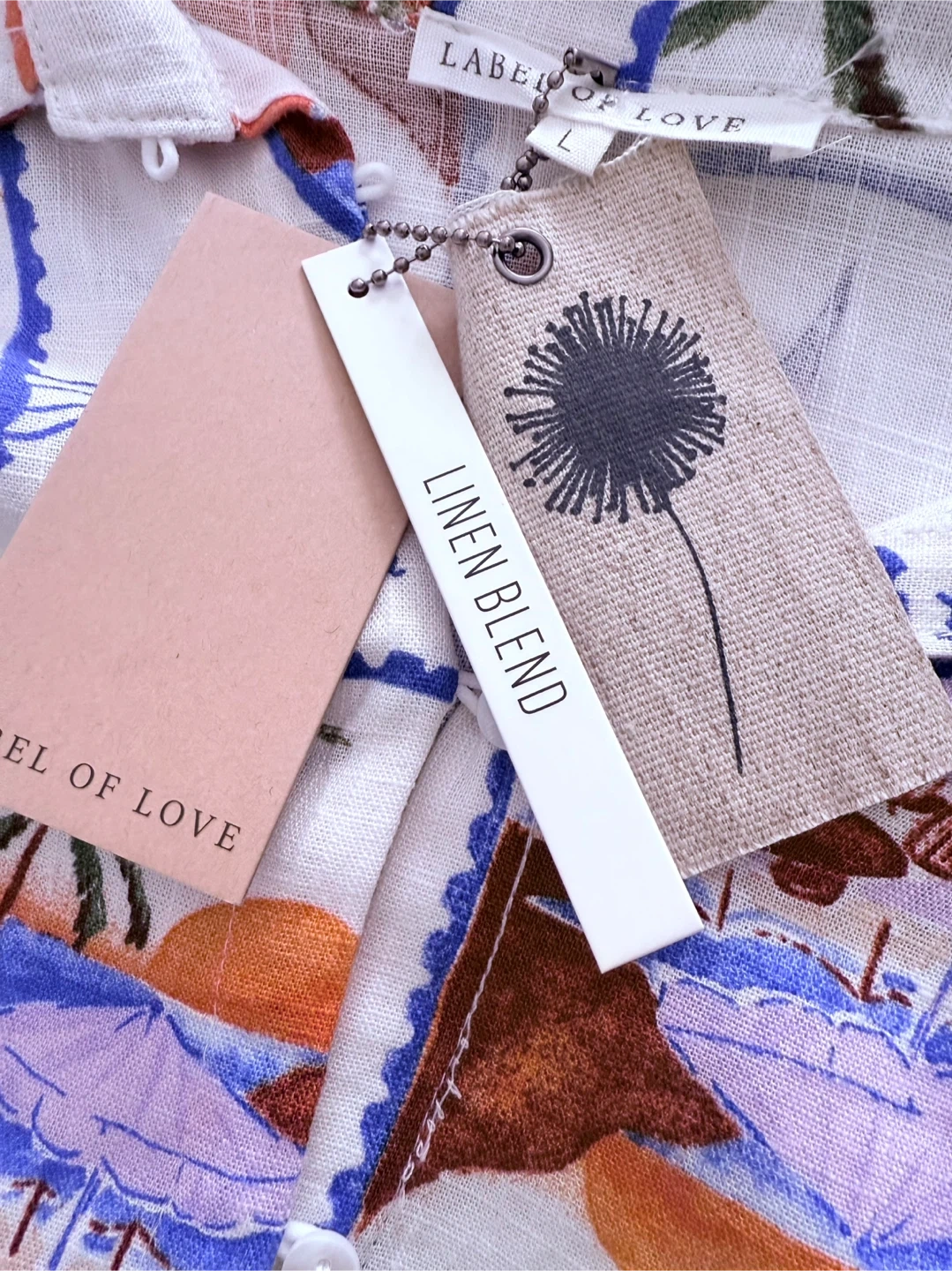 458Selling a Label of Love shirt dress in size Large! The design is called 'Blue Moon' and it's made from a linen blend, perfect for warmer weather. The shirt features a unique print with beachy and postcard-like motifs. It's in great condition and ready for a new home! Ptp 23” Length 33”