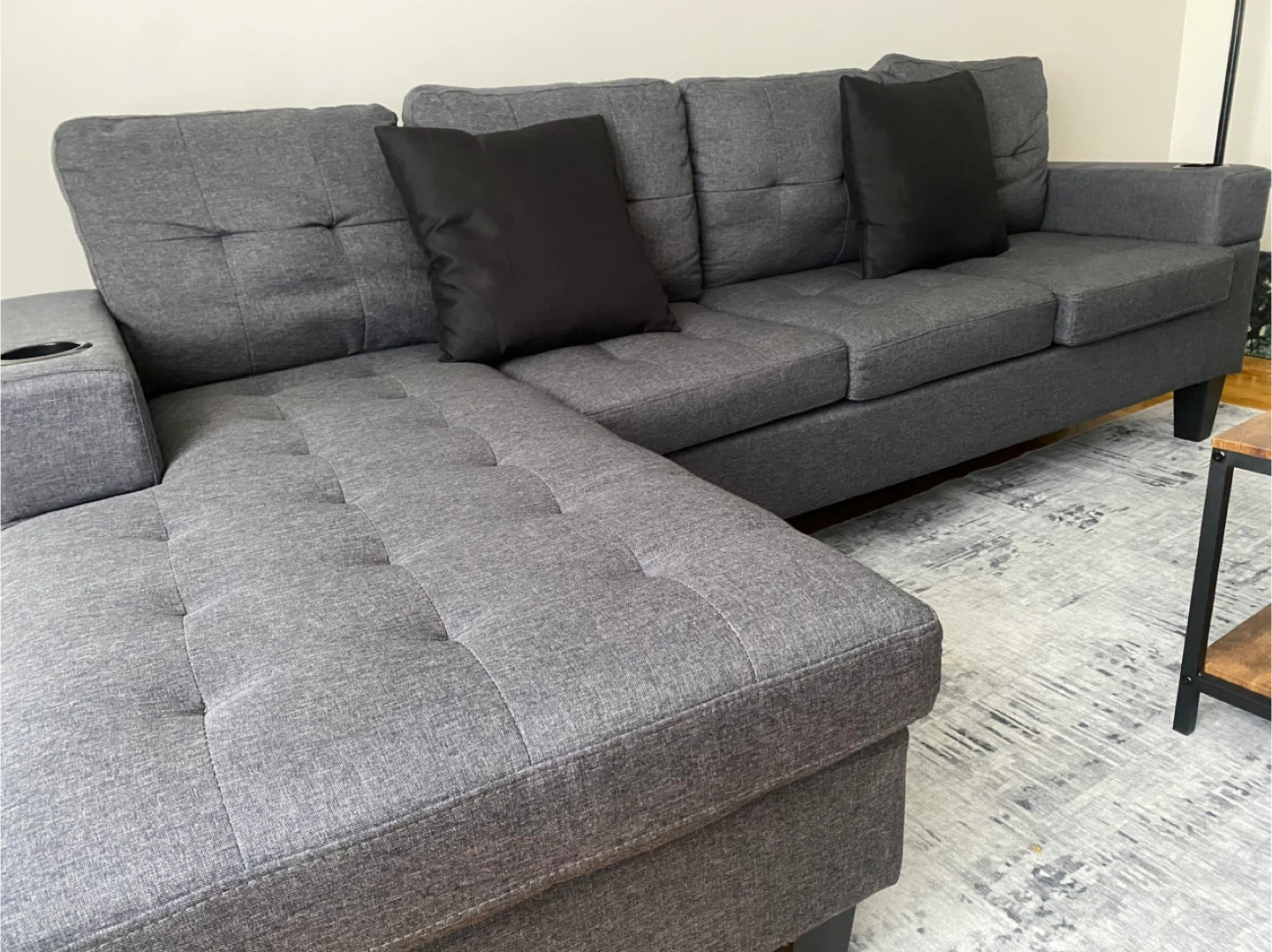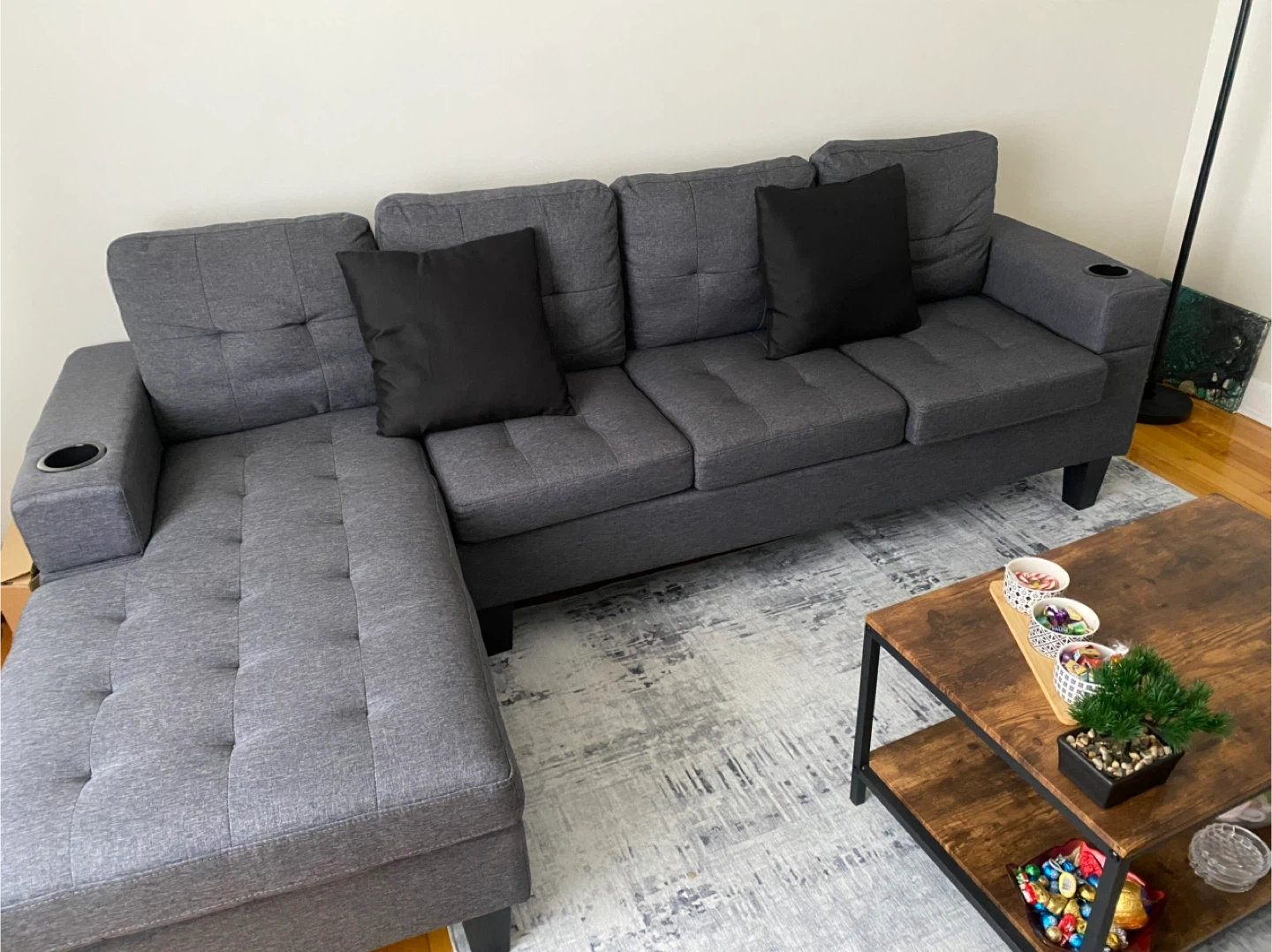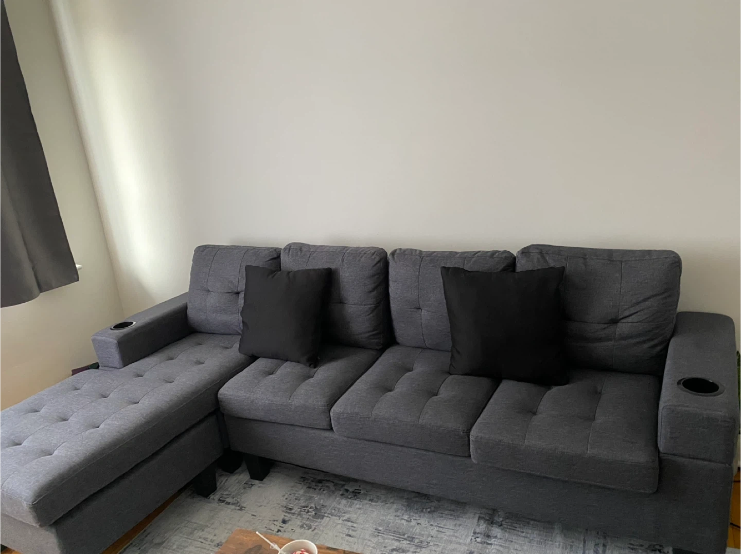 Selling a comfortable gray sectional sofa! It features a chaise lounge on one end, perfect for relaxing. The couch includes two black throw pillows and built-in cup holders on both ends for convenience. It's in great condition and ready for a new home
