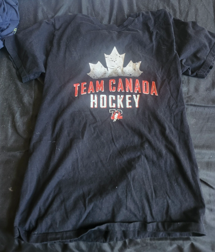 Selling a Team Canada Hockey t-shirt. It's black with the iconic maple leaf and 'TEAM CANADA HOCKEY' printed on the front. Great for showing your Canadian pride!
