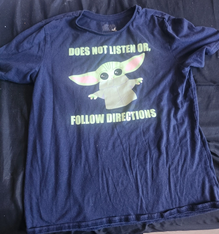 Here's a cute Star Wars t-shirt featuring Baby Yoda! The shirt is navy blue and has a graphic of Baby Yoda with the words "DOES NOT LISTEN OR, FOLLOW DIRECTIONS" printed on it. It's in good used condition and ready for a new home