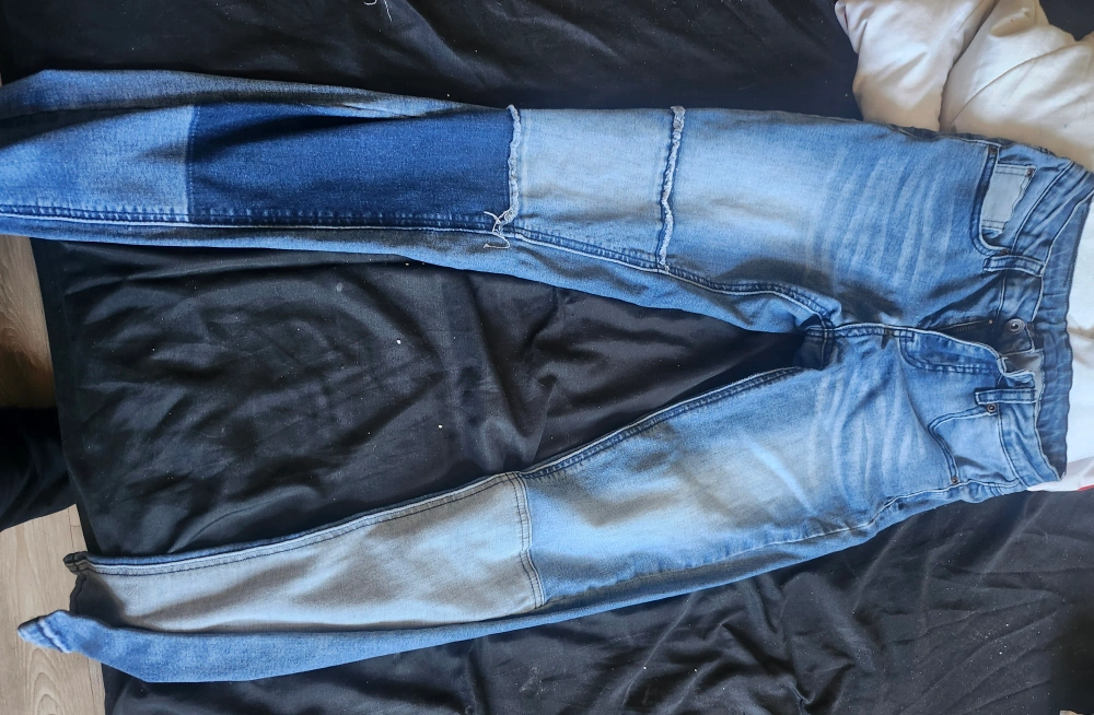 Selling a pair of stylish patchwork denim jeans. These jeans feature a unique design with different shades of blue denim patches. They are in good condition and ready for a new home!