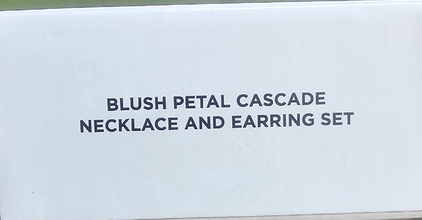Selling a beautiful Blush Petal Cascade necklace and earring set. This set features a delicate cascade design with blush-coloured petals. It's perfect for adding a touch of elegance to any outfit!