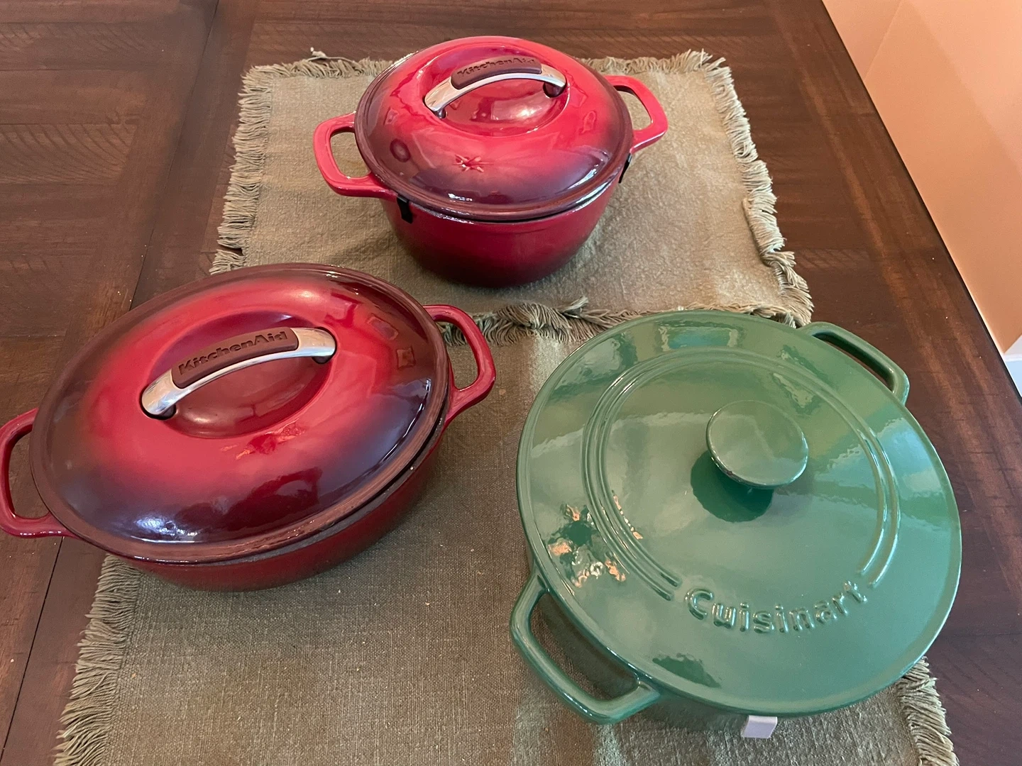 Selling 2 KitchenAid and 1 Cuisinart enameled Dutch oven. They Show signs of use with some wear and scratches on the interior but perfect for slow cooking and braising your favourite meals!
