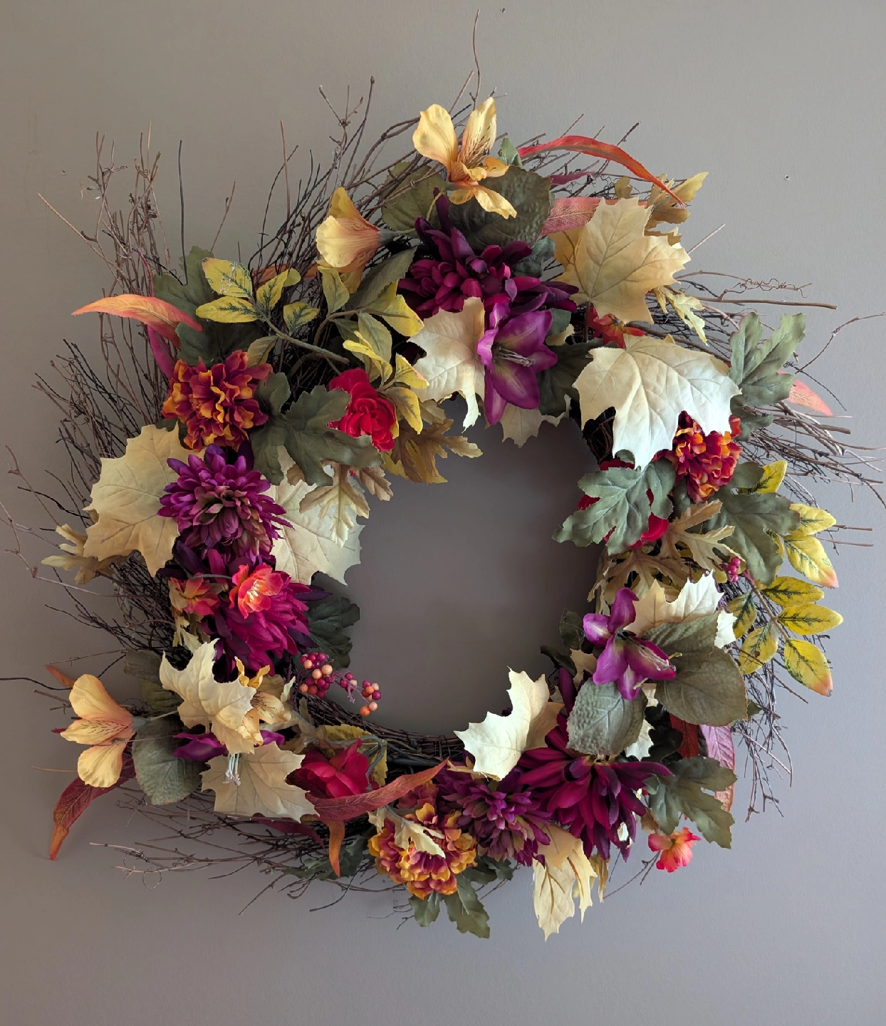 This stunning, grapevine wreath, made up of high quality silk flowers, leaves, and berries is a must see! Its blend of beautiful fall colours makes it a compliment to any decor!