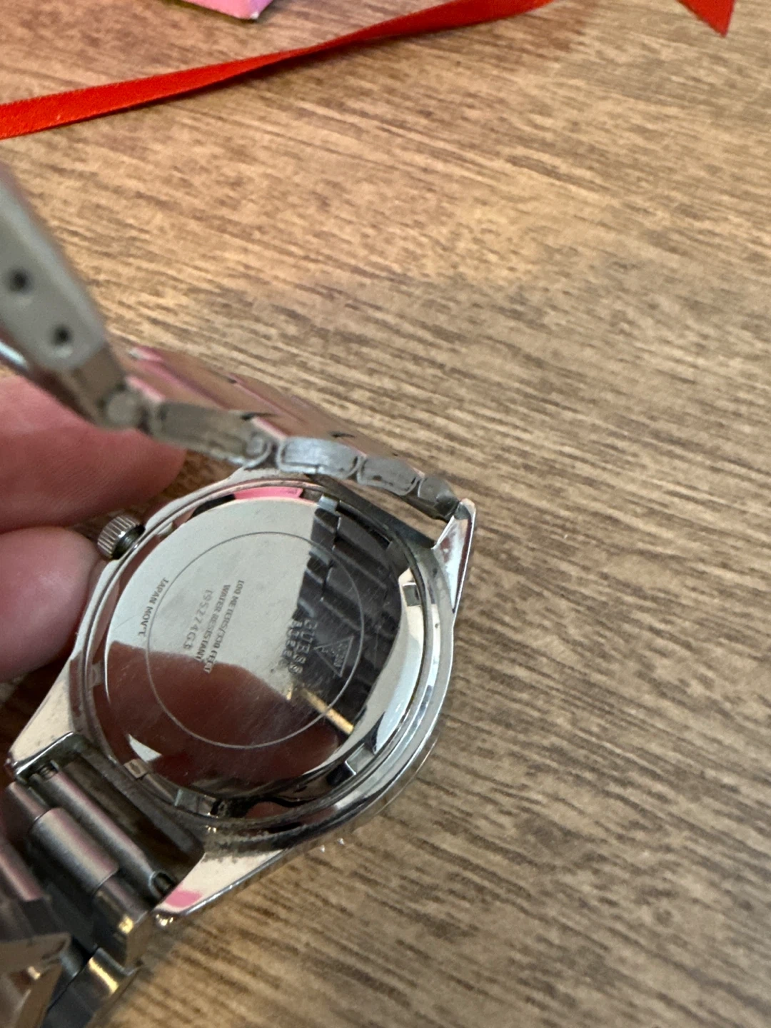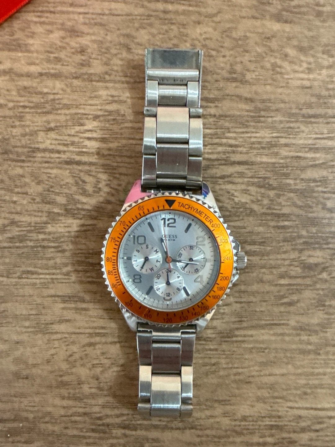 Selling a Guess men's watch with a silver tone and orange accents. It has a tachymeter and a stainless steel band. The watch is in good condition and ready for a new owner! PLEASE NOTE: Pickup in Tuscany area or meetup up at Market Mall. Price is firm. Cash only. Please send me a message with date/time to pickup.