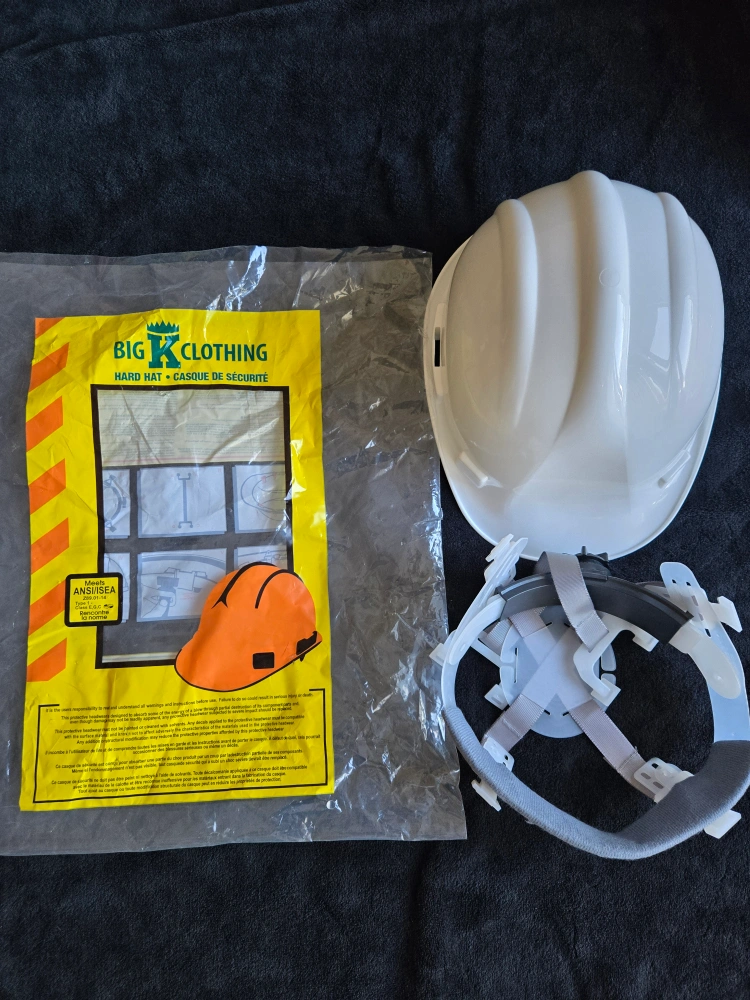 10Selling white hard hats from Big K Clothing! It comes with the original packaging. It is a hard hat with a suspension system inside for comfort and safety.
