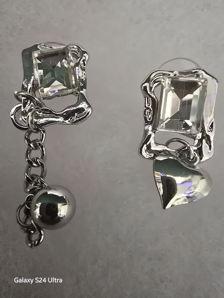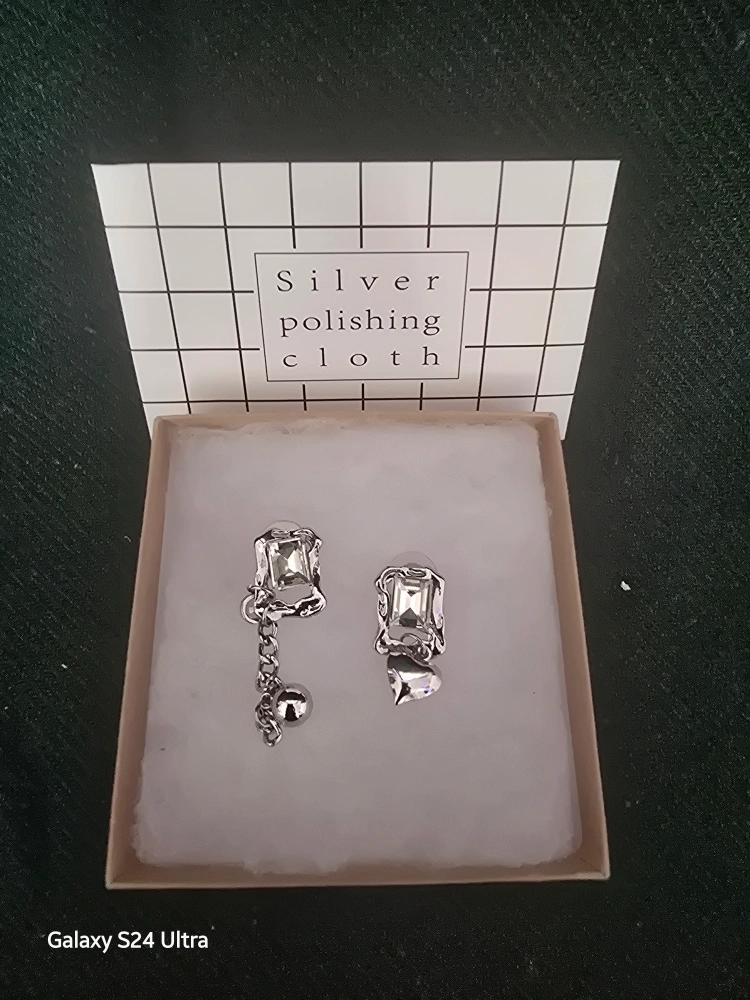 10These are a pair of silver earrings with cubic zirconia stones. One earring has a dangling chain with a ball charm, and the other has a heart charm. They come with a silver polishing cloth and box.