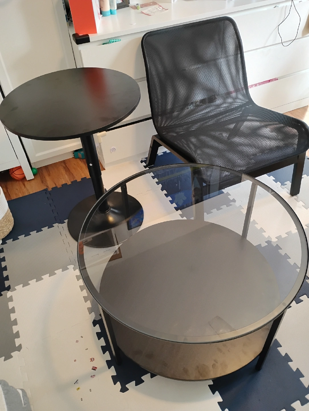 Selling a black mesh chair Ikea nolmyra , round glass to coffee table ikea vittsjo and adjustable pedestal table. all items are in good condition and would be great additions to any home! coffee tables $40 chairs $20 pedestal table$ 30 available 6x chairs all in similar condition 2x coffee tables 2x pedestal tables or the whole lot $200. attempts at negotiations are really unwanted. available for 7 days they were used at a 3 conventions