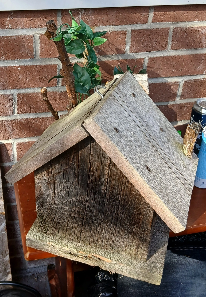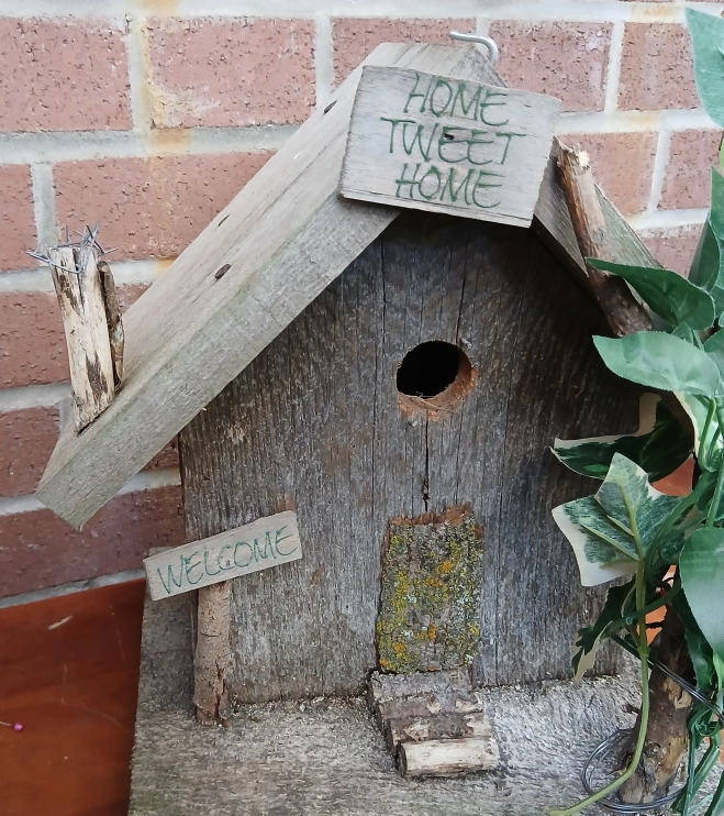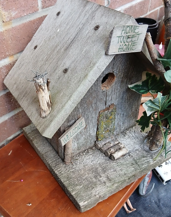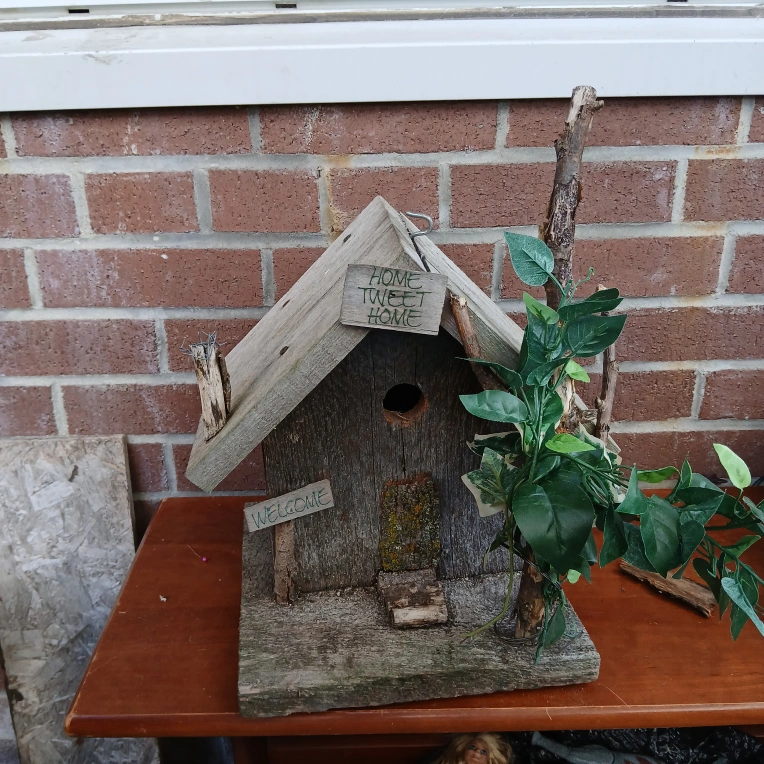 Charming rustic birdhouse with a weathered look. Features a 'Home Tweet Home' sign and a 'Welcome' sign. A unique addition to any garden or outdoor space 12 by 12 inches