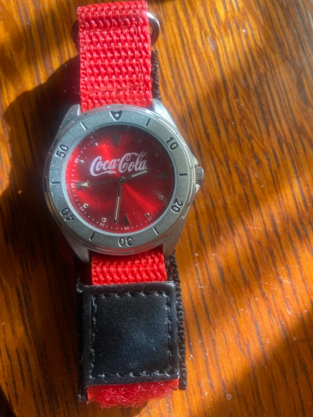 Selling a Coca-Cola watch with a vibrant red band! It's in great condition and ready to add a pop of color to your wrist. The watch face features the iconic Coca-Cola logo. Perfect for collectors or anyone who loves a touch of retro style