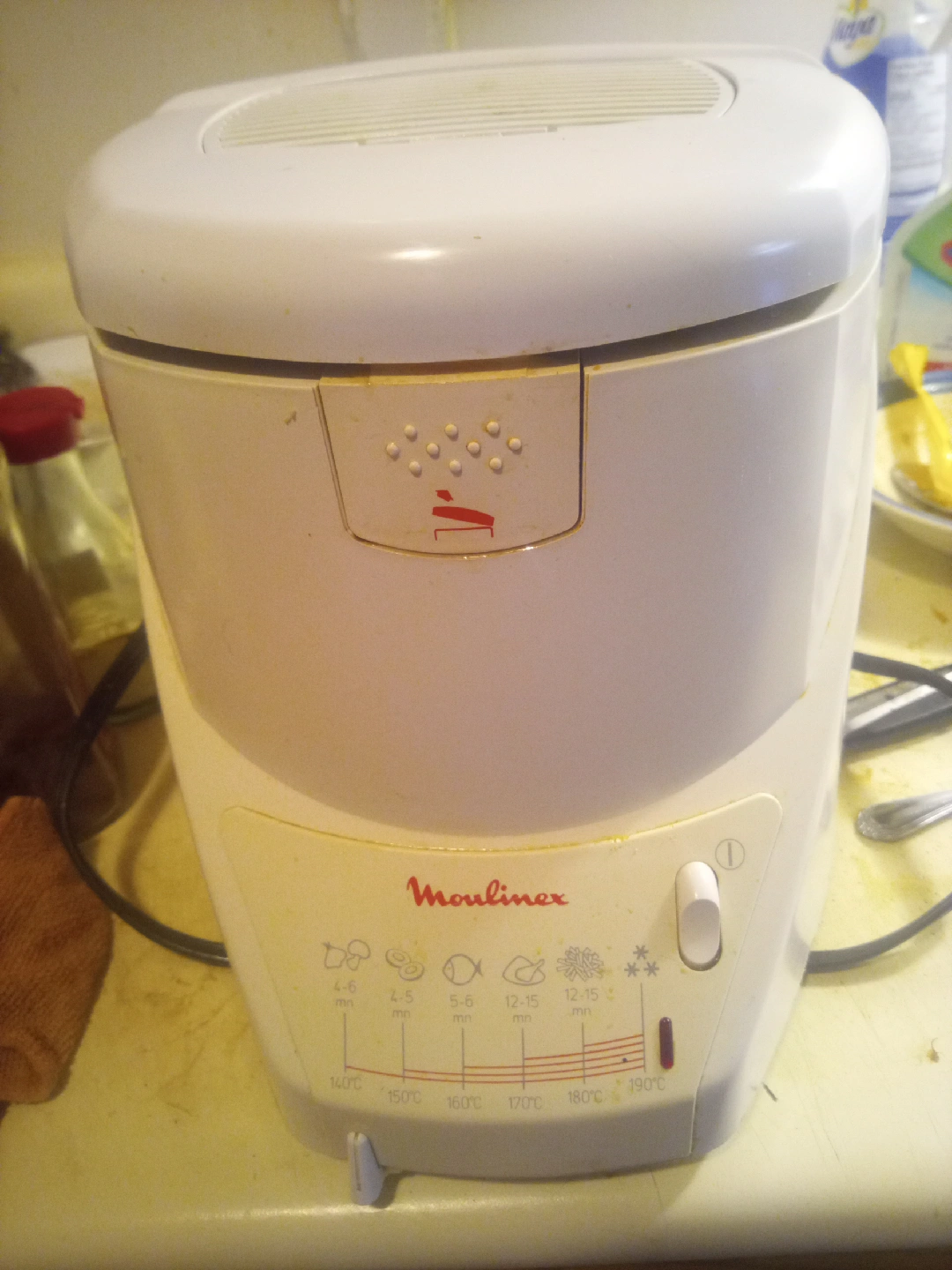 Selling a Moulinex deep fryer. It has temperature settings from 140°C to 190°C for different types of food like fries, fish, and chicken