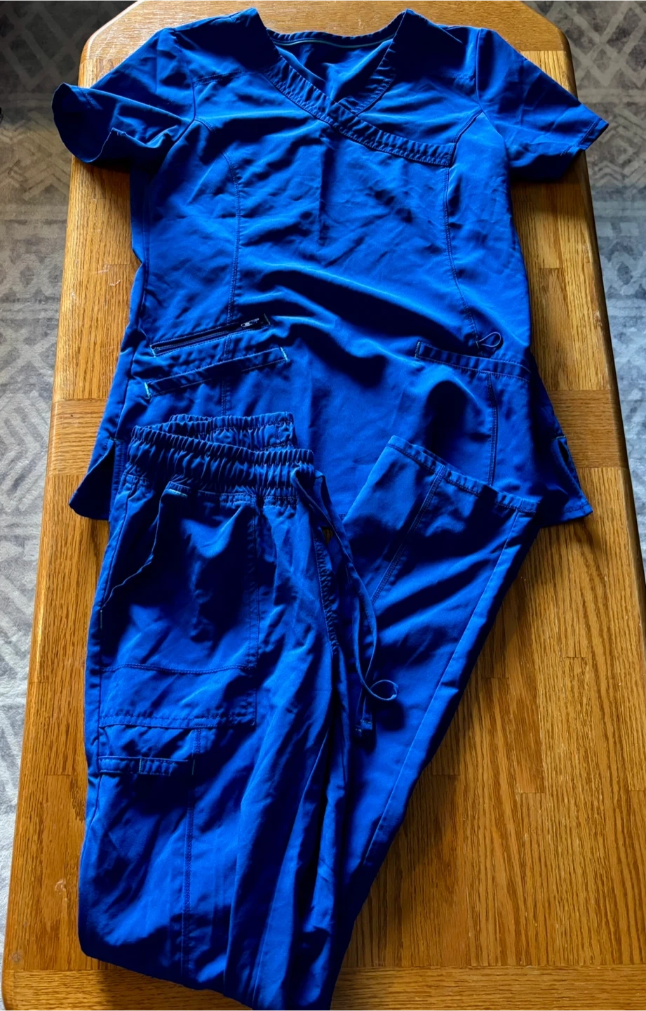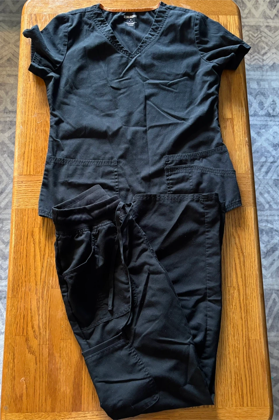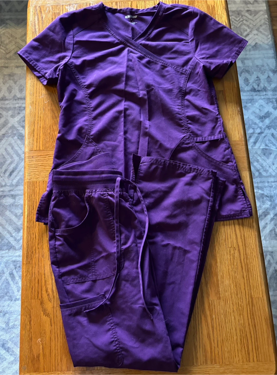 Selling sets of scrubs. They are in great condition and ready for a new home. Available in black, purple, and blue and assorted tops and bottoms.