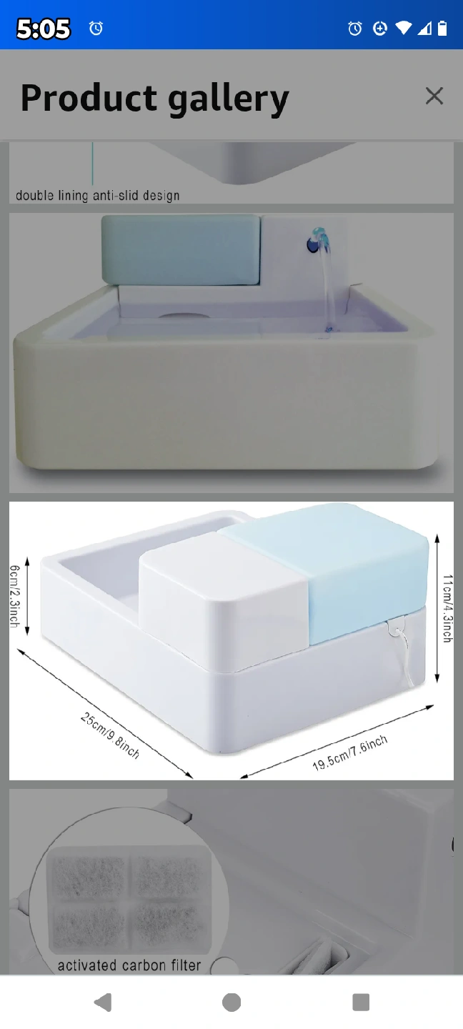 My dog didn't use this. She was used to metal or ceramic water dishes, so maybe the plastic, or the noise of the motor, or her senility/old age. It's 10" by 8" and suitable for small dogs or for cats.